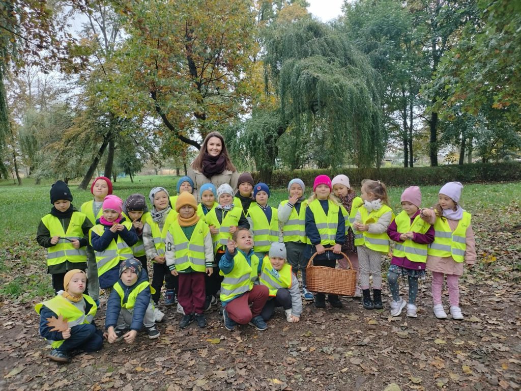 Dziś grupa Krasnale udała się na spacer do parku. Celem wyjścia była obserwacja zmian zachodzących w przyrodzie jesienią. Dzieci utrwaliły nazwy znajdujących się w parku drzew oraz rozwinęły umiejętności matematyczne poprzez naukę mierzenia obwodu drzewa.