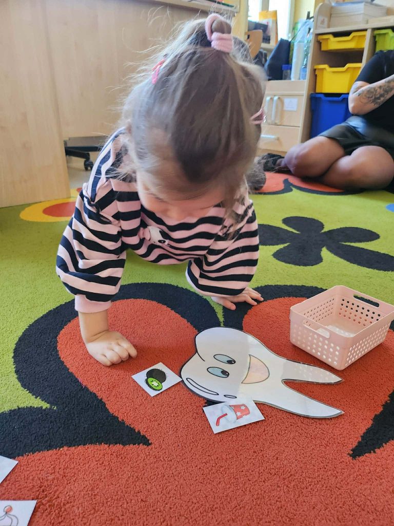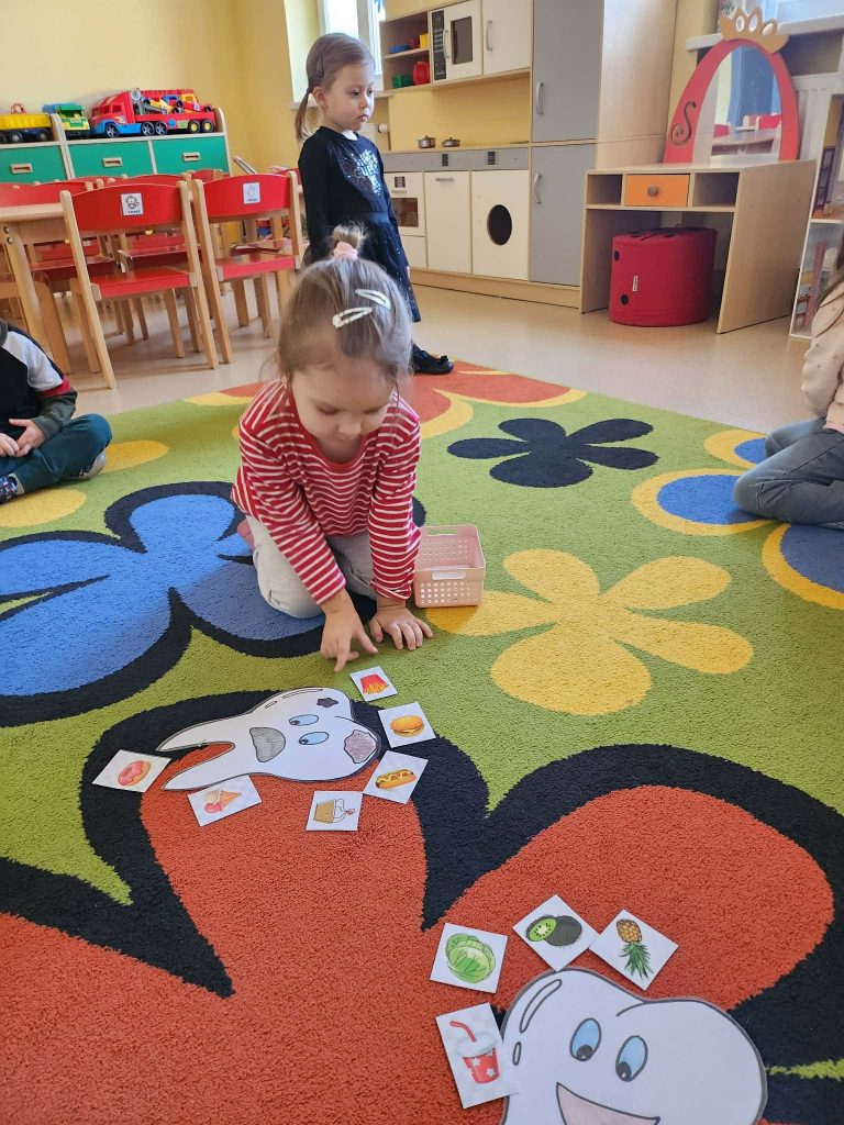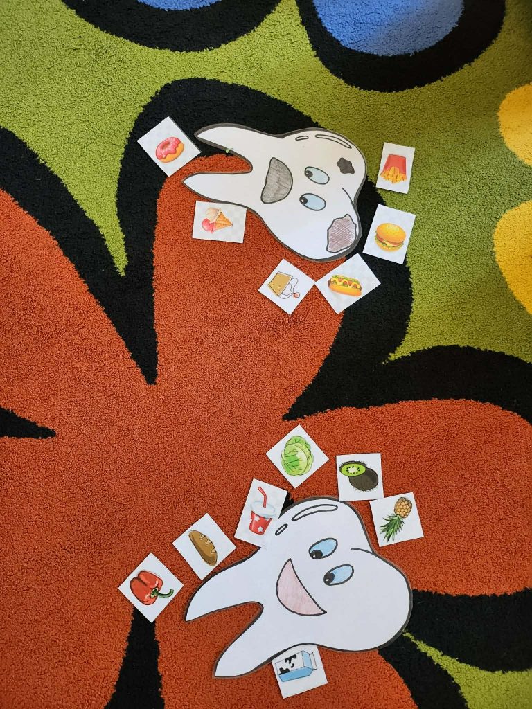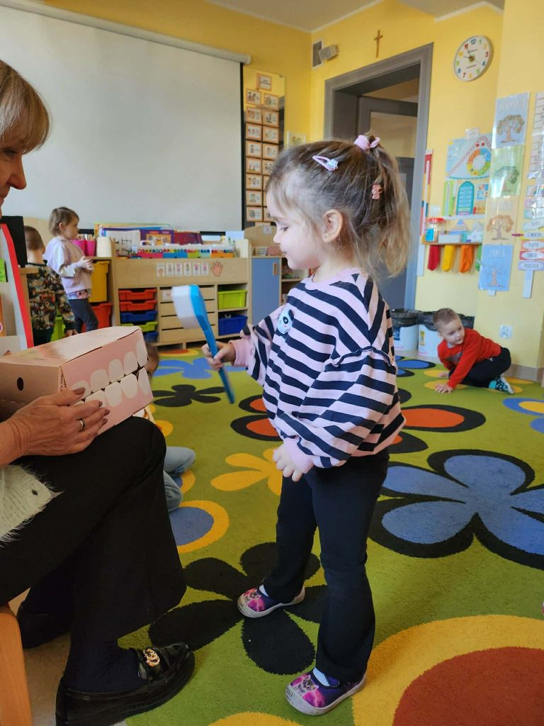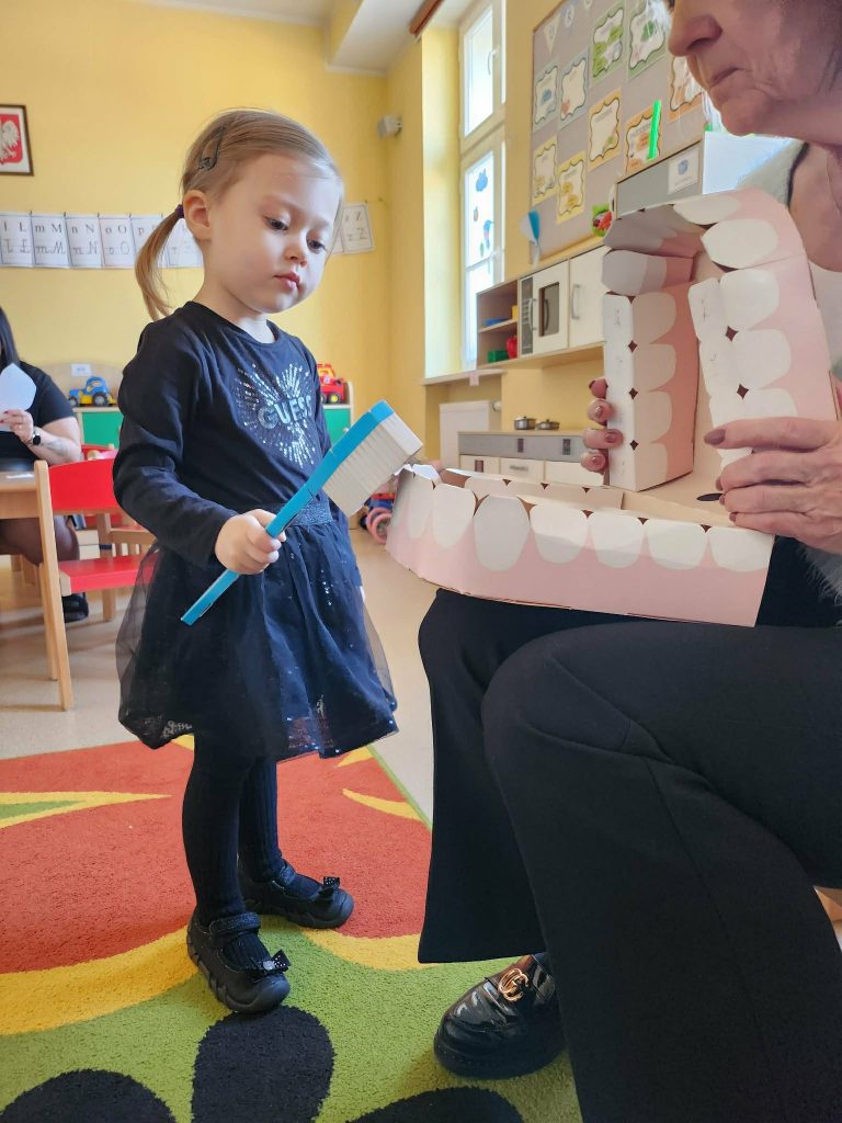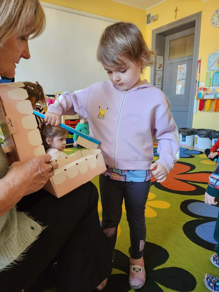 ’Dnia 05.03.2026 r. w naszym przedszkolu grupa „Kotków” obchodziła Dzień Dentysty. Z tej okazji odwiedziła nas przedszkolna higienistka, która opowiedziała dzieciom, jak ważna jest higiena jamy ustnej oraz regularne wizyty u dentysty.Następnie, na papierowym modelu szczęki, zaprezentowała prawidłową technikę mycia zębów. Każde dziecko miało możliwość samodzielnie spróbować.W dalszej części zajęć dzieci dowiedziały się, jakie produkty są zdrowe dla naszych zębów. Przedszkolaki poznały bohaterów zajęć – ,,Ząbka Zenka’’ i ,, Zosię’’, a potem przyporządkowywały różne produkty spożywcze do tych, które sprzyjają zdrowiu zębów oraz tych, które mogą im szkodzić.To był bardzo wartościowy i pełen uśmiechu dzień!
