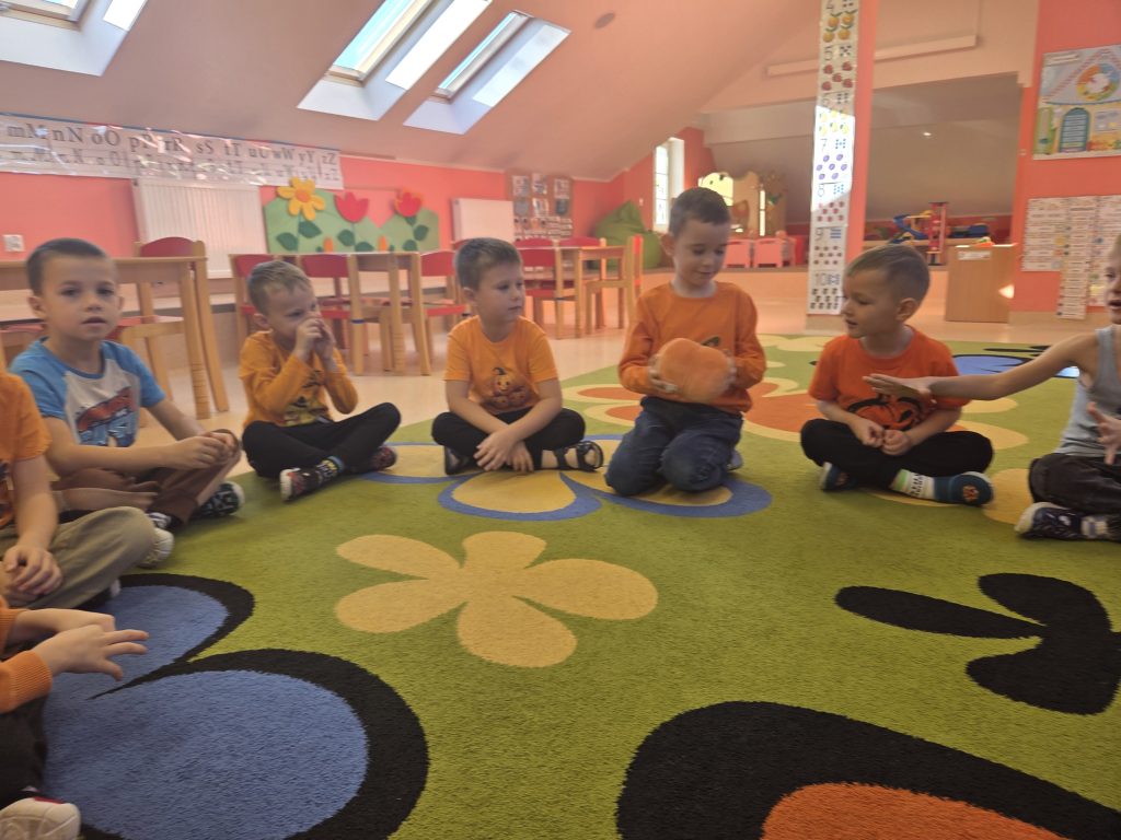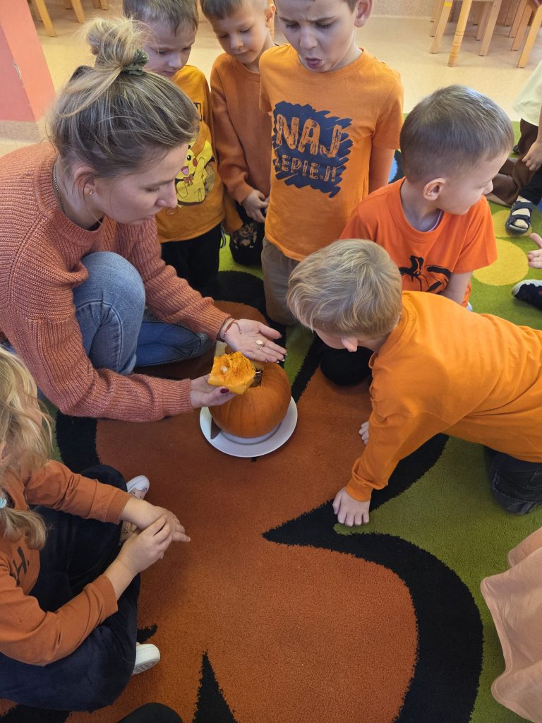 W grupie Pszczółki obchodziliśmy wesoły Dzień Dyni! Tego dnia w naszym przedszkolu królował kolor pomarańczowy. Dzieci przyszły ubrane w stroje w dyniowych barwach, a sale ozdobione były jesiennymi dekoracjami.Podczas zajęć przedszkolaki poznały różne odmiany dyni, dowiedziały się, do czego można ją wykorzystać, a także uczestniczyły w licznych zabawach ruchowych i plastycznych z dynią w roli głównej. Nie zabrakło też wspólnego śpiewania i degustacji pysznych przysmaków z dyni.