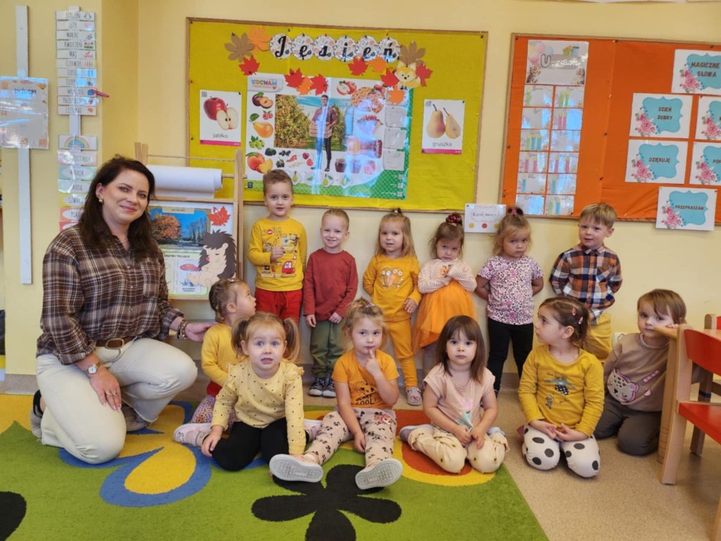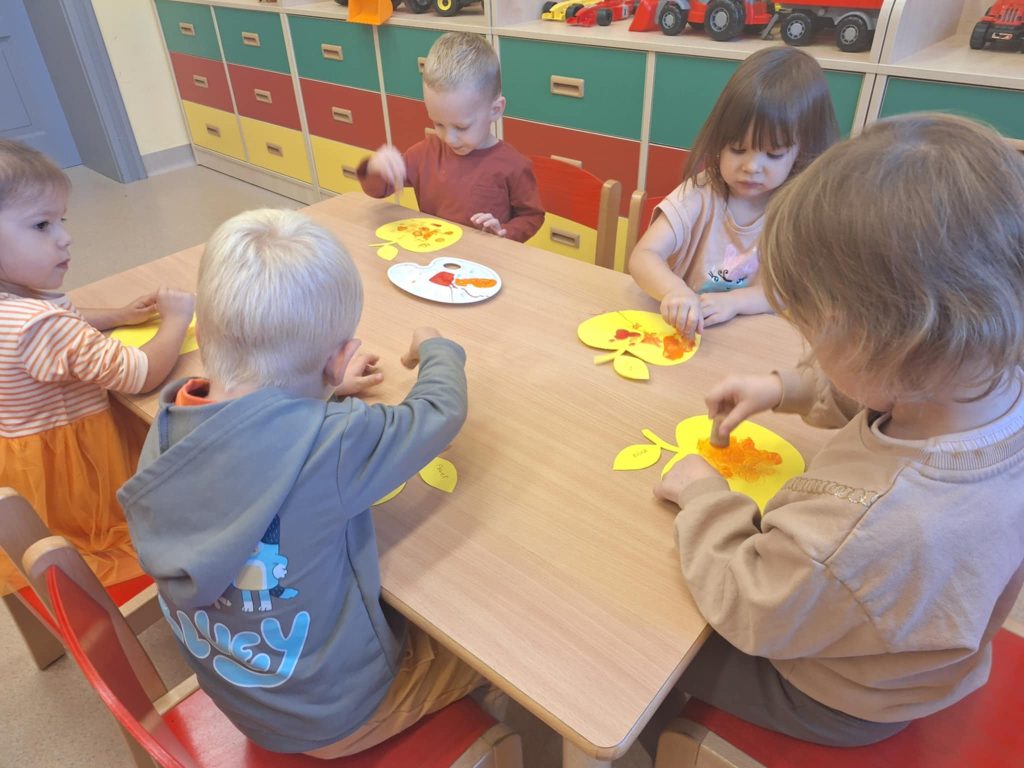 Maluszki poznały nową porę roku – jesień, która właśnie się rozpoczęła. W pierwszy dzień jesieni, ubrani w kolorach żółtym, pomarańczowym, czerwonym i brązowym rozmawialiśmy o tym, z czym kojarzy nam się ta różnokolorowa pora roku. Dzieci wiedzą już, jakie kolory mają jesienne liście i drzewa. 3-latki poznały owoce i warzywa – mogły je zobaczyć i dotknąć, a także wykonały pracę plastyczną „Jabłuszko”. O jesieni będziemy jeszcze z pewnością dużo rozmawiać na zajęciach. Ta pora roku jest taka piękna i ma w sobie dużo uroku.