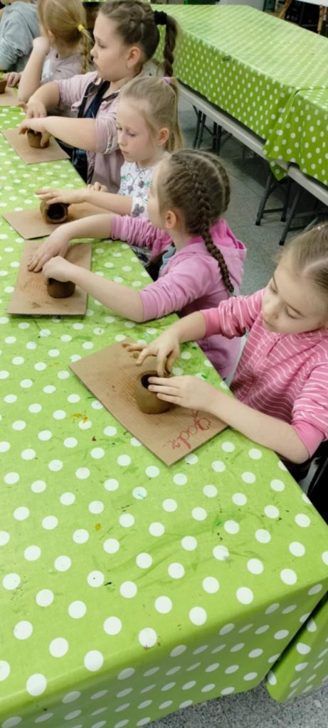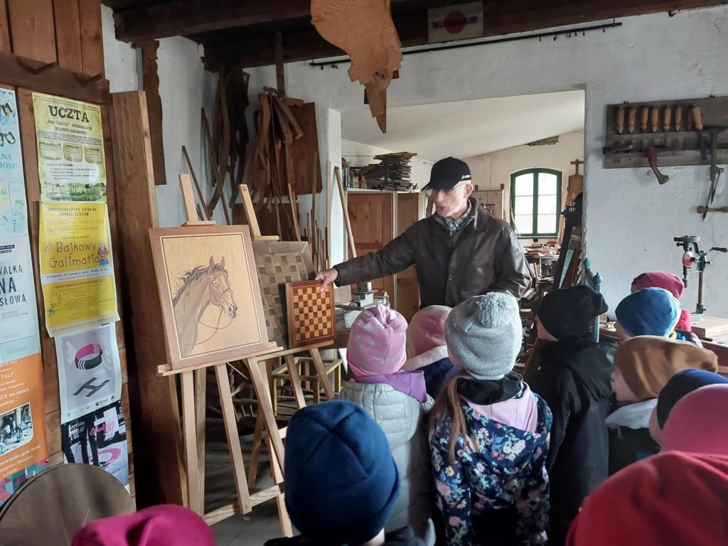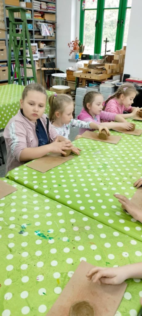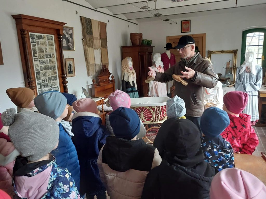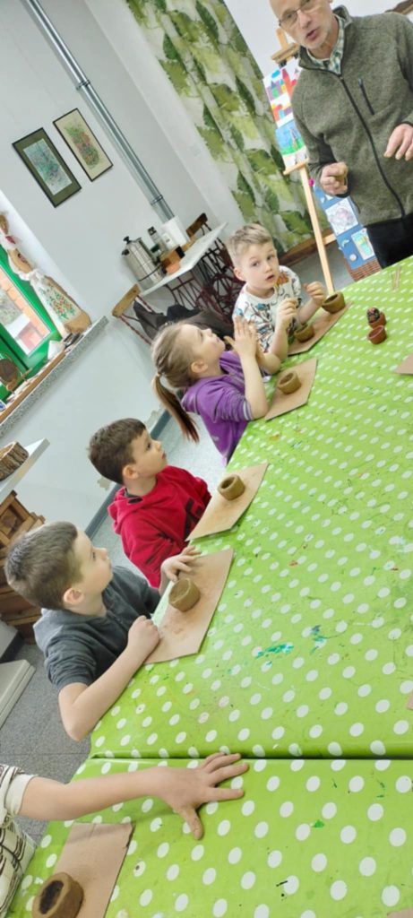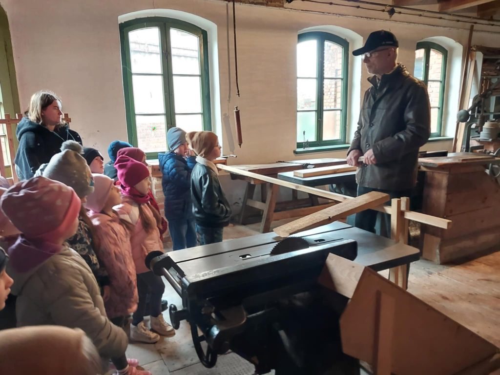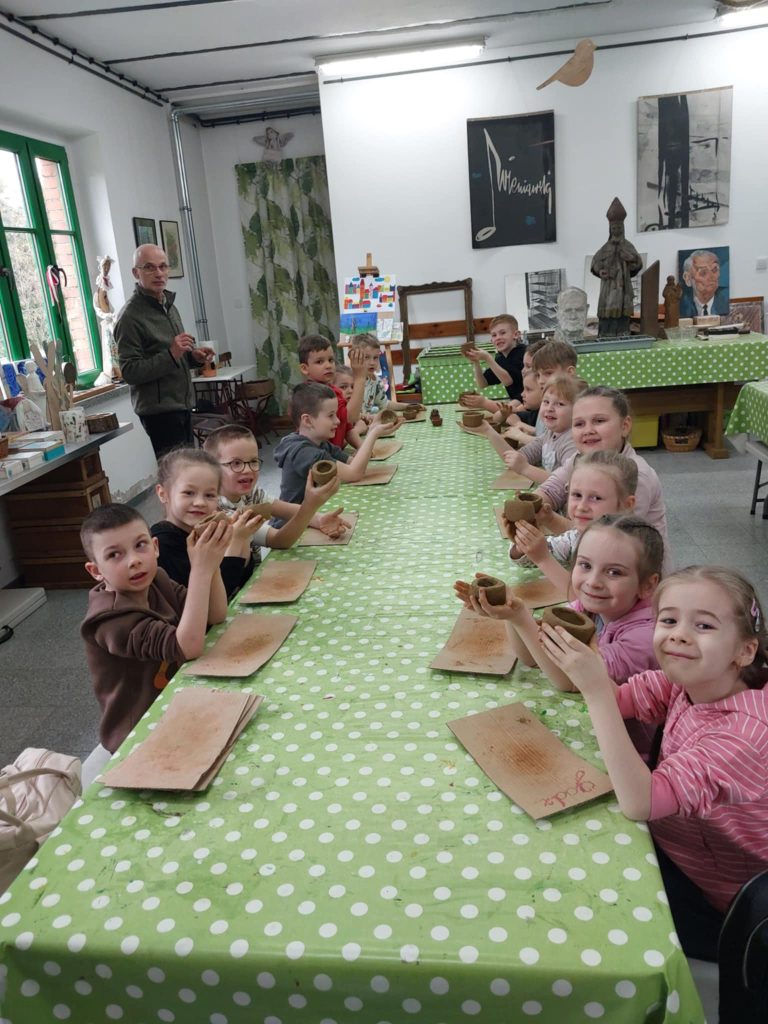 W czwartek 27 marca Kotki pojechały do Muzeum do Krobi. Poznaliśmy w ten dzień historie rzemiosła stolarskiego oraz zawód stolarza. Zapoznaliśmy się z maszynami i obróbką drewna używanego do wyrobu mebli i zabawek. Zobaczyliśmy wiele ciekawych starych przyrządów używanych kiedyś np. żelazko na węgiel oraz magiel. Pan przewodnik zapoznał nas z kulturą Biskupizny i pokazał charakterystyczne stroje, które były popularne w tej okolicy. Punktem przewodnim naszej wycieczki do muzeum były warsztaty ceramiczne. Każdy z nas dostał kulkę gliny i wykonał samodzielnie z niej naczynie do jajka wielkanocnego. Ten dzień był dla nas bardzo ciekawy, a wyjazd sprawił nam wielką radość.
