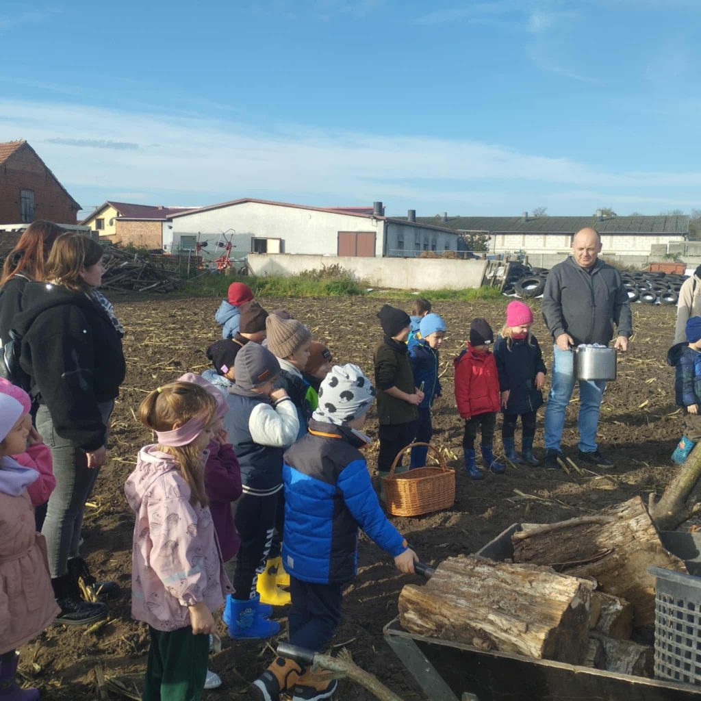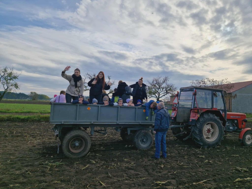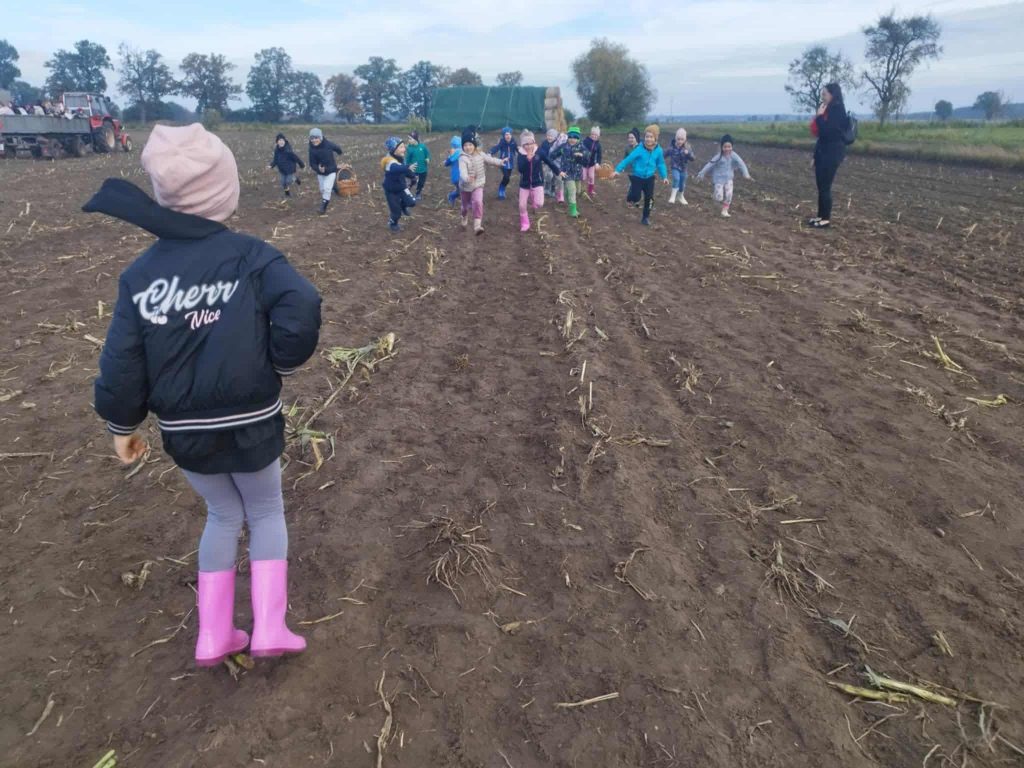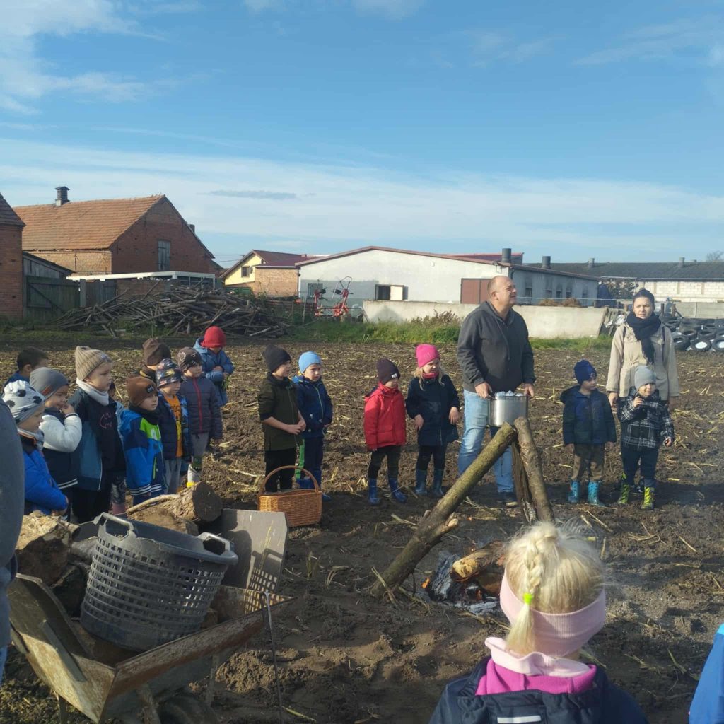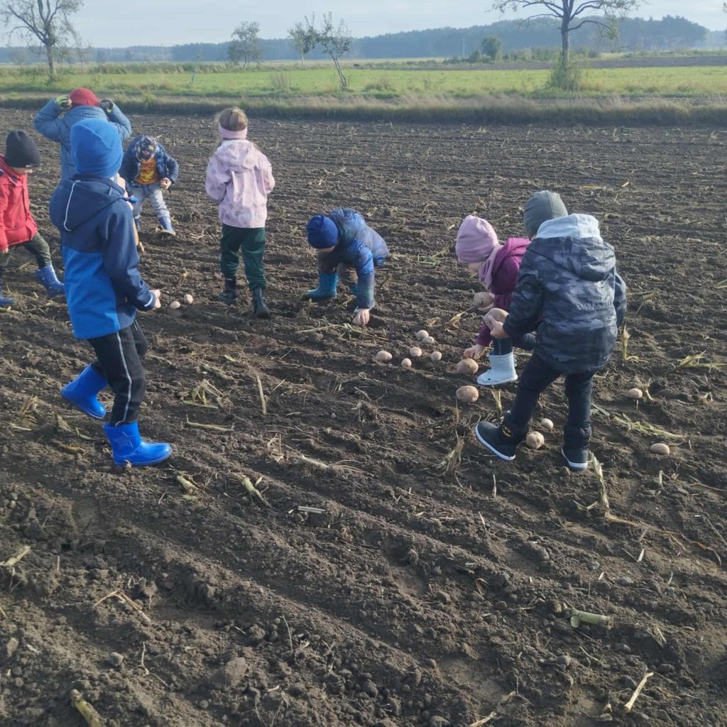 Pod koniec października dzieci z grup Krasnale i Żabki wybrały się do Sowin na Święto Pieczonego Ziemniaka, zorganizowane dzięki gościnności rodziców Julki z grupy Żabek. Podczas wspólnej zabawy czekało na dzieci wiele atrakcji — konkurencje sportowe, zbieranie ziemniaków do koszy oraz przejażdżka na przyczepie. Nie zabrakło też pysznego jedzenia: ziemniaków z ogniska, kiełbasek, ciasta oraz przekąsek przygotowanych z ziemniaków. To był radosny i pełen wrażeń dzień spędzony w miłej, jesiennej atmosferze.