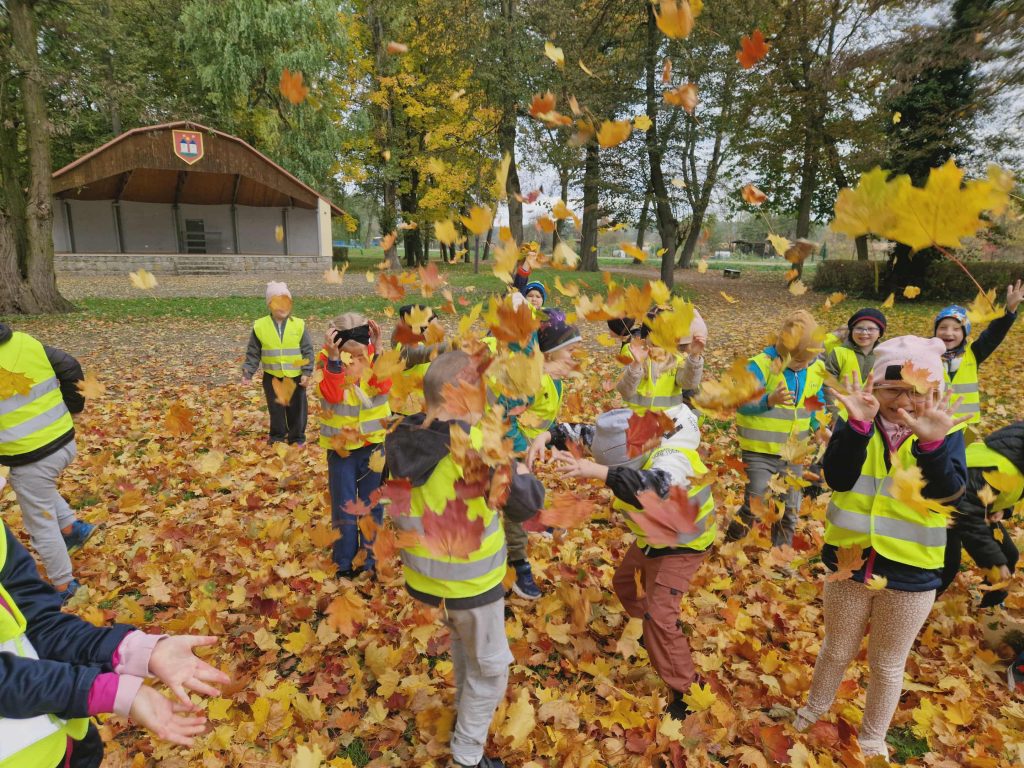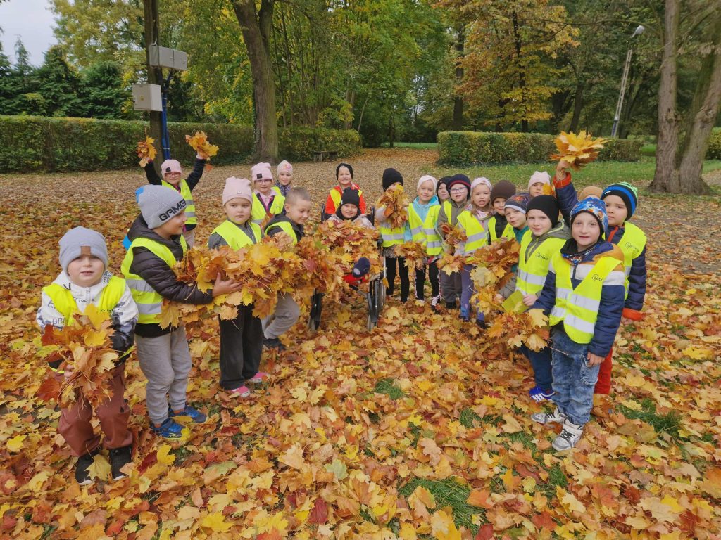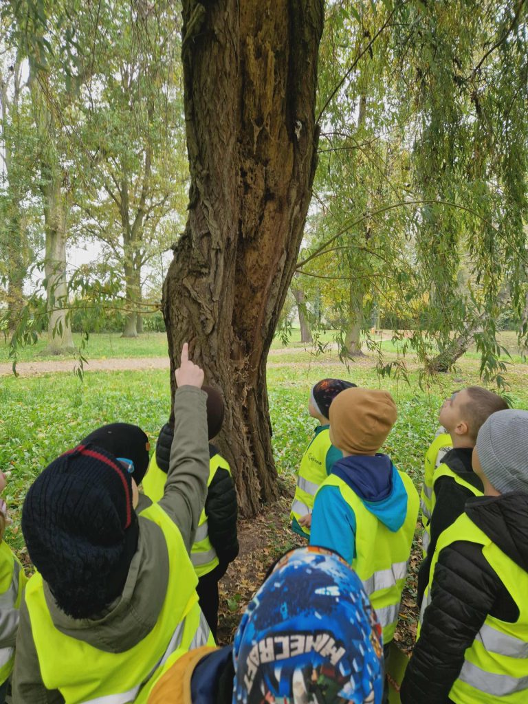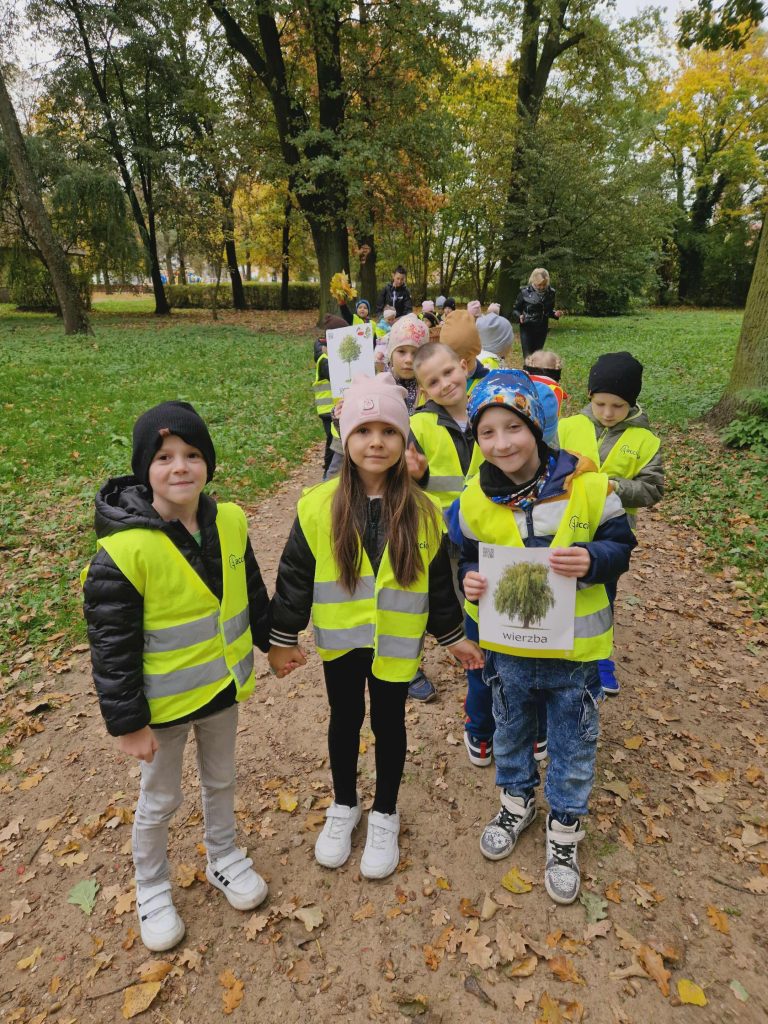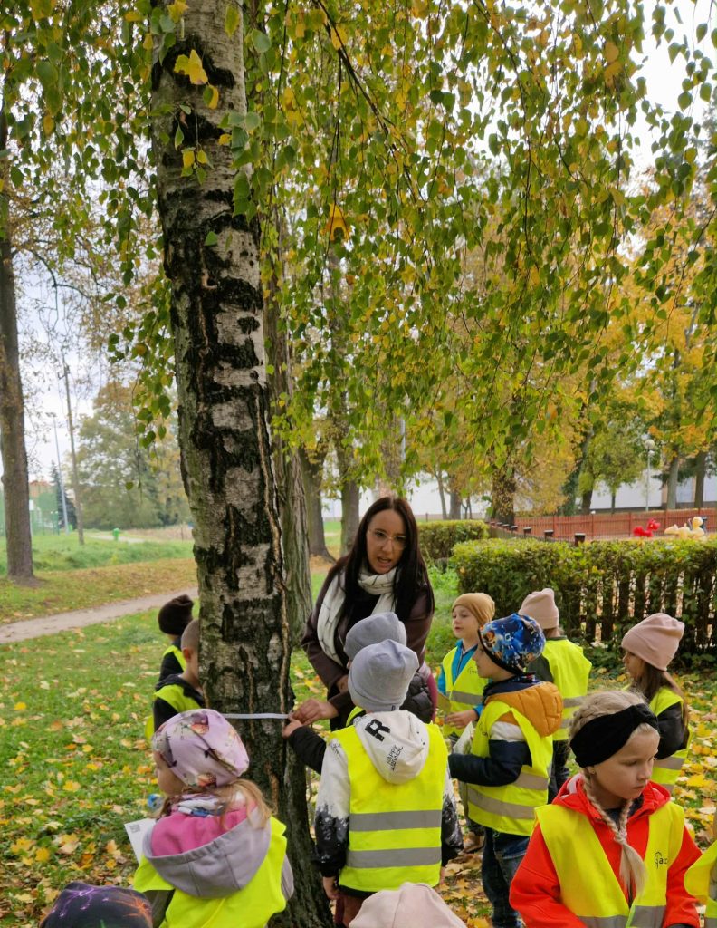 Dziś grupa Krasnale udała się na spacer do parku. Celem wyjścia była obserwacja zmian zachodzących w przyrodzie jesienią. Dzieci utrwaliły nazwy znajdujących się w parku drzew oraz rozwinęły umiejętności matematyczne poprzez naukę mierzenia obwodu drzewa.