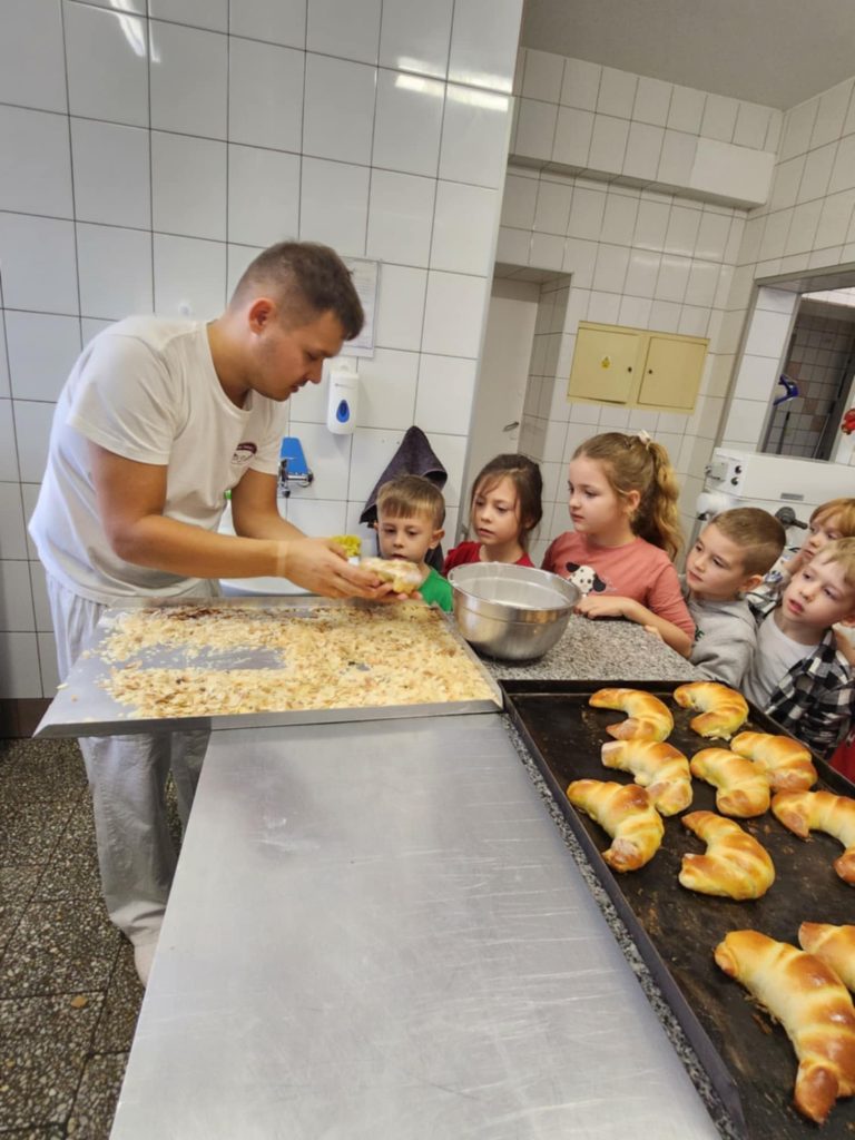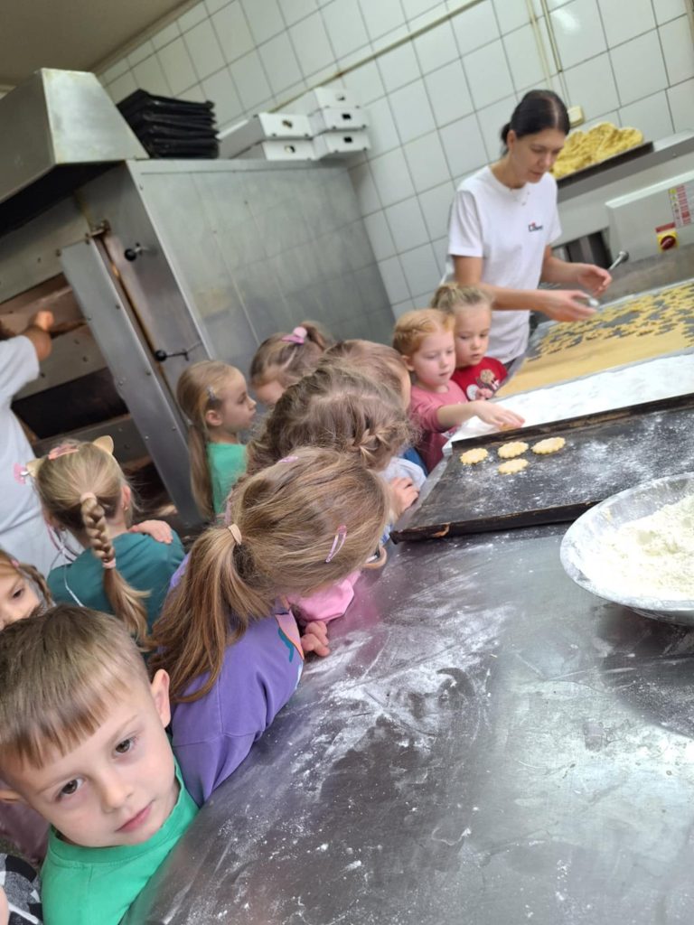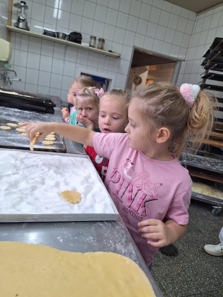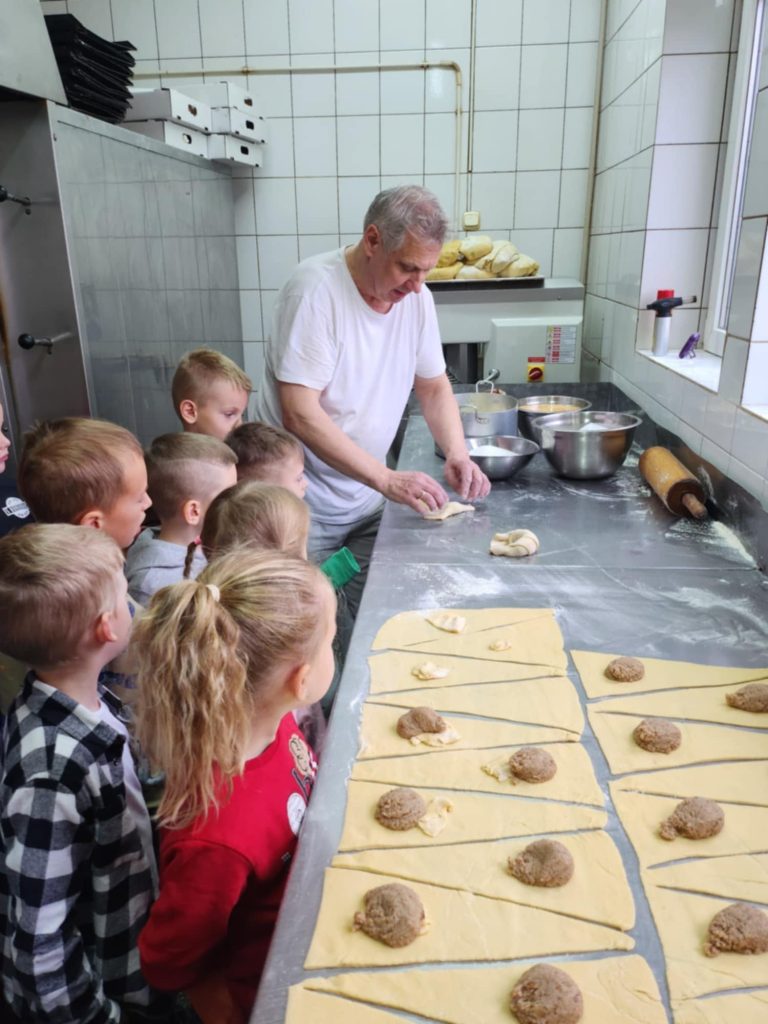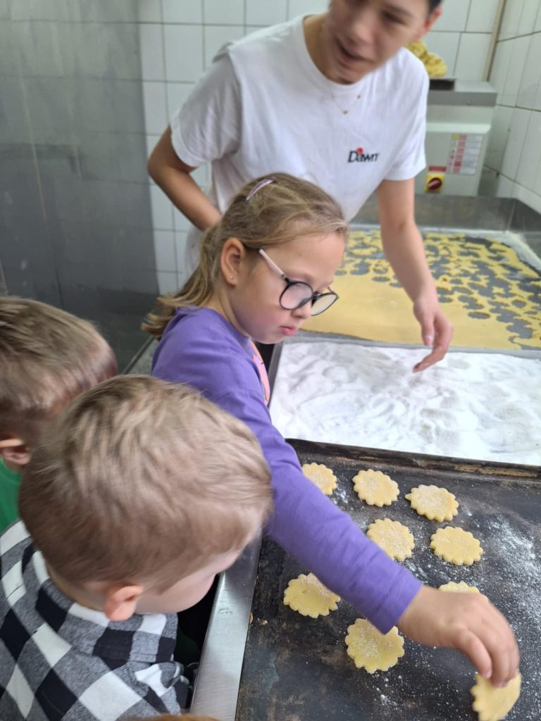 KUBUSIE podczas wizyty w Cukierni u państwa Lisiaków poznały tajniki przygotowywania rogali marcińskich – dowiedziały się o tradycji ich wypiekania, składnikach i sposobie przygotowania. Każde dziecko mogło własnoręcznie udekorować rogala, nakładając lukier i ozdoby. Następnie dzieci przystąpiły do dekorowania malinowych babeczek i ciastek, używając kolorowych posypek, kremów i owoców. W trakcie zajęć poznały również maszyny cukiernicze, takie jak miksery do wyrabiania ciasta czy piece obserwując ich działanie i dowiadując się, jak pomagają w pracy cukierników. Była to słodka i edukacyjna przygoda, pełna kreatywności i nowych doświadczeń! Bardzo dziękujemy