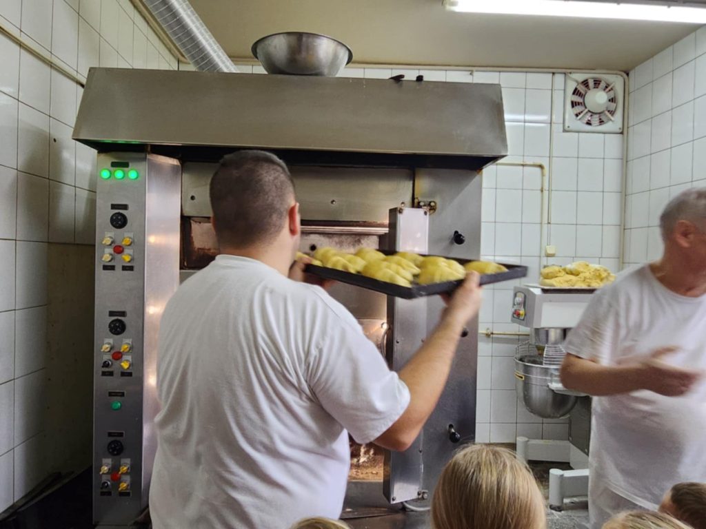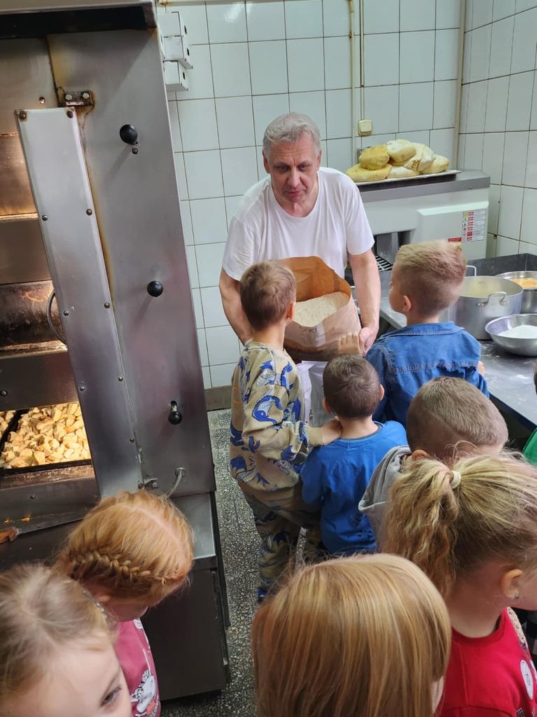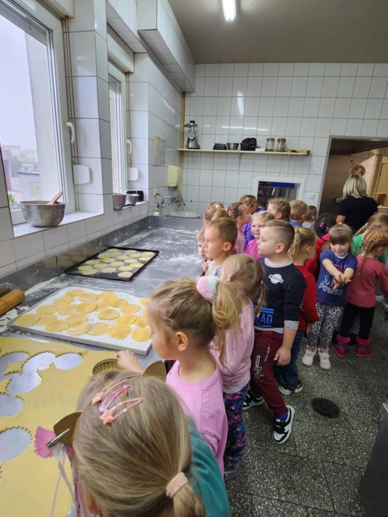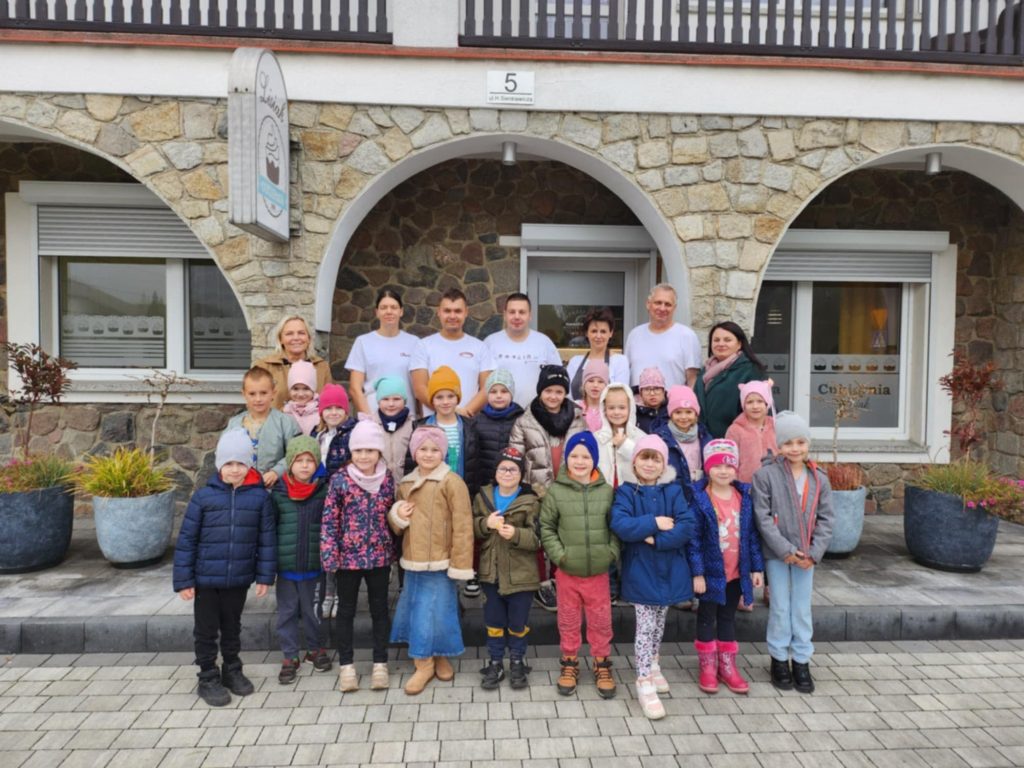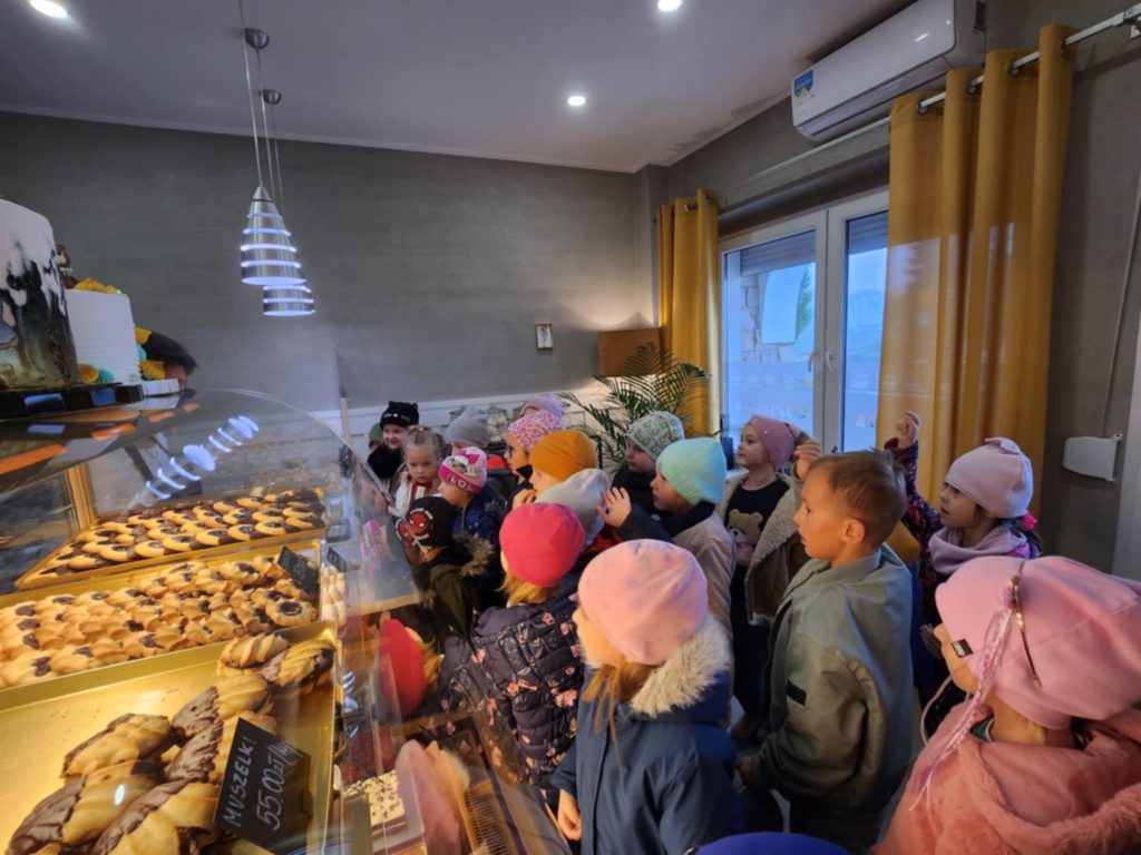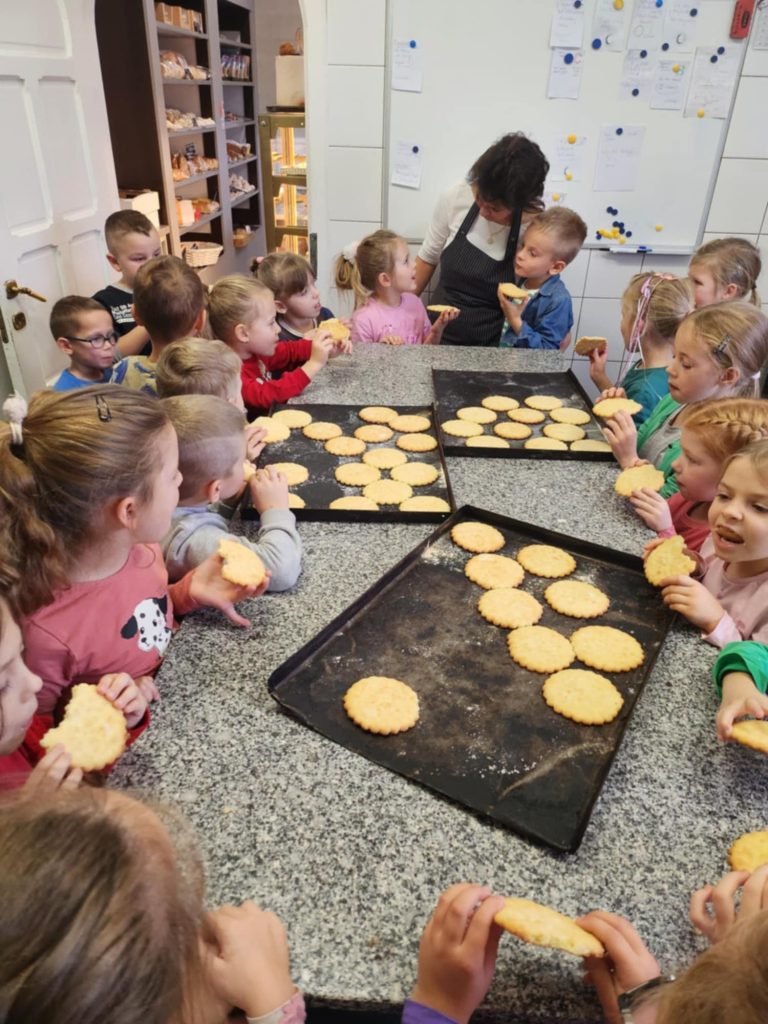 KUBUSIE podczas wizyty w Cukierni u państwa Lisiaków poznały tajniki przygotowywania rogali marcińskich – dowiedziały się o tradycji ich wypiekania, składnikach i sposobie przygotowania. Każde dziecko mogło własnoręcznie udekorować rogala, nakładając lukier i ozdoby. Następnie dzieci przystąpiły do dekorowania malinowych babeczek i ciastek, używając kolorowych posypek, kremów i owoców. W trakcie zajęć poznały również maszyny cukiernicze, takie jak miksery do wyrabiania ciasta czy piece obserwując ich działanie i dowiadując się, jak pomagają w pracy cukierników. Była to słodka i edukacyjna przygoda, pełna kreatywności i nowych doświadczeń! Bardzo dziękujemy