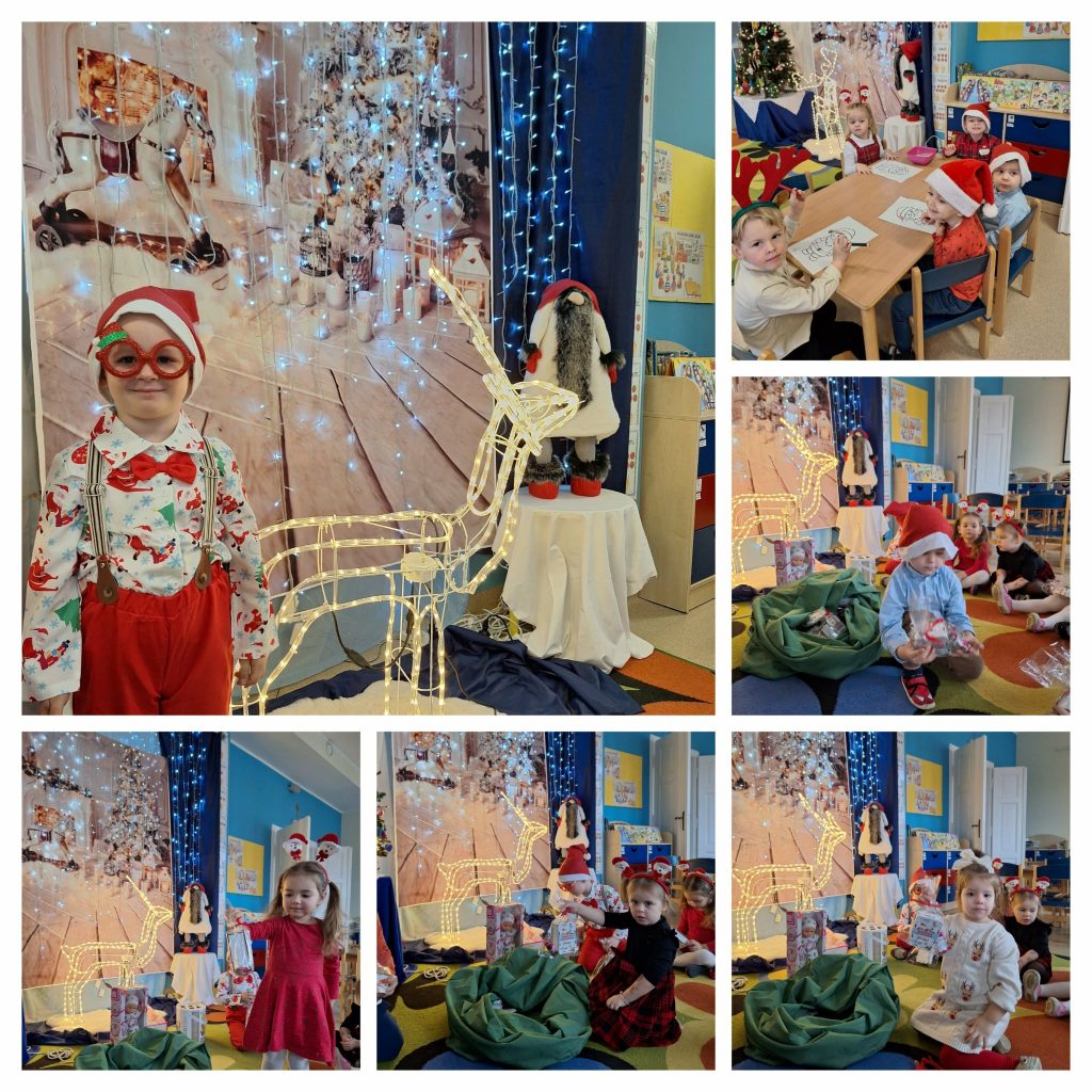 Mikołaj w grupie Kubusie pojawił się pełen radości, a jego dzwonki brzmiały jak maleńkie iskierki zimy 🔔. Wesoły i serdeczny rozdawał dzieciom prezenty z dużym uśmiechem, zamieniając salę w małą wyspę świątecznego ciepła.
