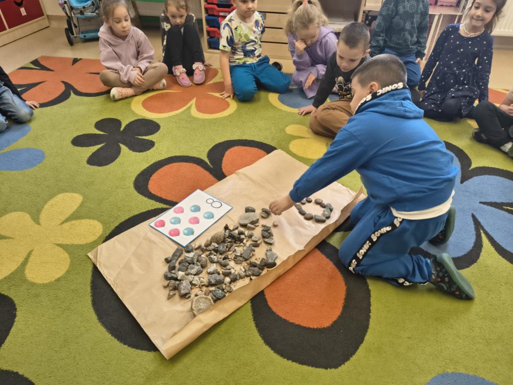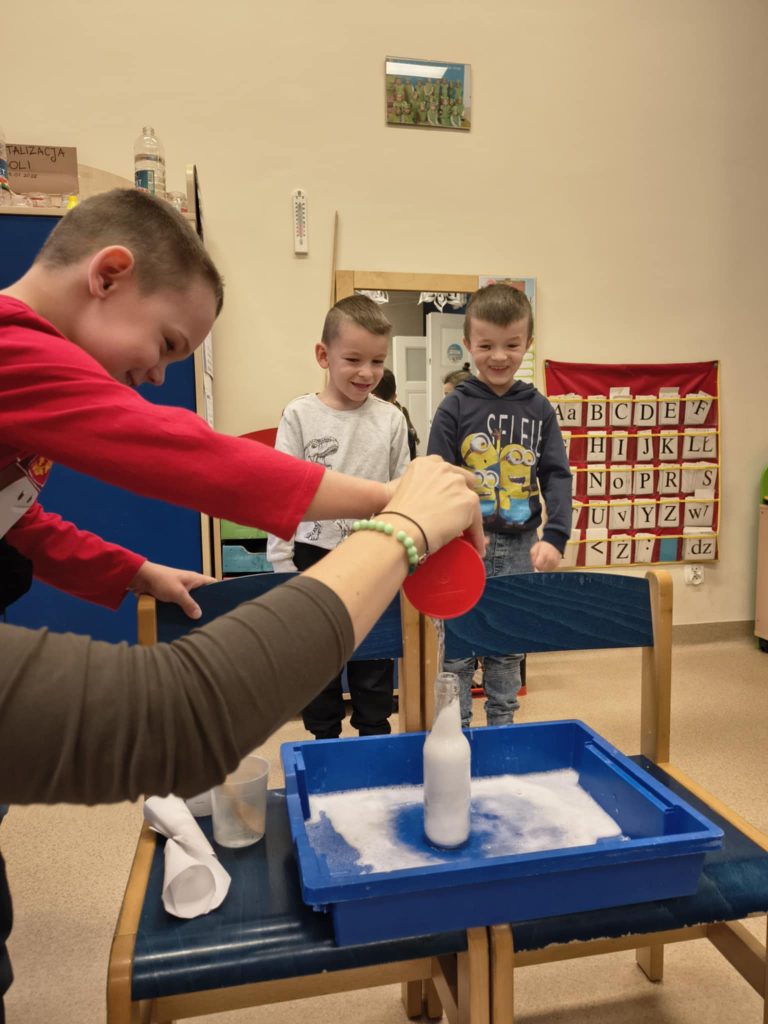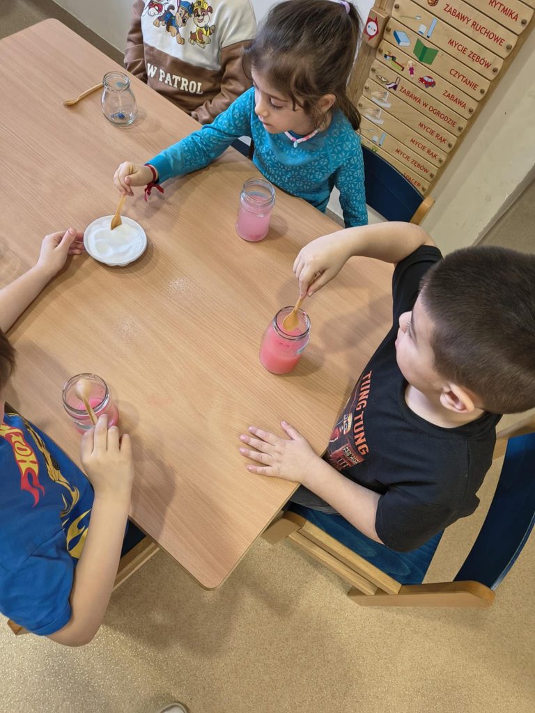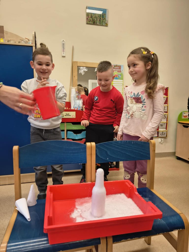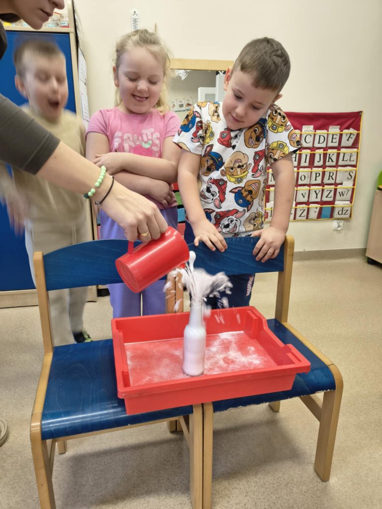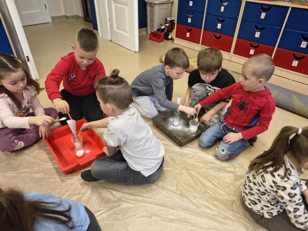Żabki w minionym tygodniu realizowały temat: „Pod ziemią, pod wodą. Dzieci wyruszyły w fascynującą podróż do wnętrza Ziemi. Poznawaliśmy tajemnice naszej planety, jej bogactwa i niezwykłe zjawiska przyrodnicze. Przedszkolaki z dużym zainteresowaniem obserwowały proces krystalizacji soli, odkrywając, jak powstają kryształy. Dużo emocji wzbudził również temat wulkanów – dzieci dowiedziały się, jak działają i dlaczego wybuchają. Nie zabrakło także aktywności matematycznych – dzieci odwzorowywały cyfry przy użyciu kamieni, rozwijając przy tym sprawność manualną i umiejętność liczenia. Zajęcia łączyły naukę z zabawą, pobudzały ciekawość świata oraz zachęcały do samodzielnego odkrywania i eksperymentowania.