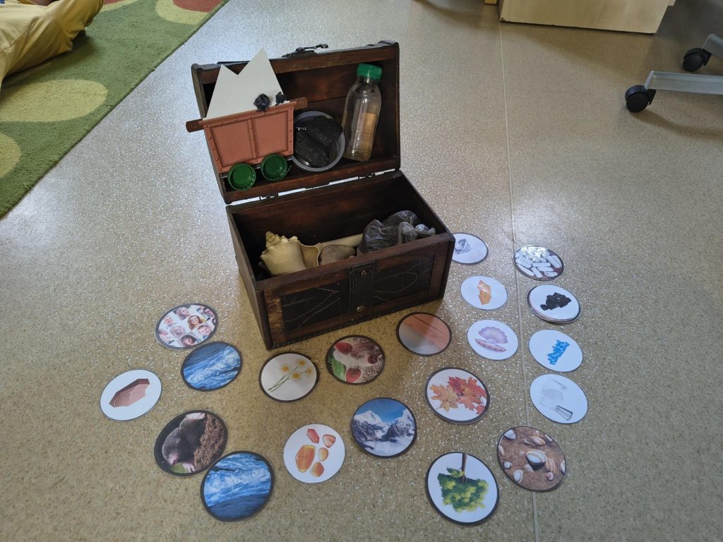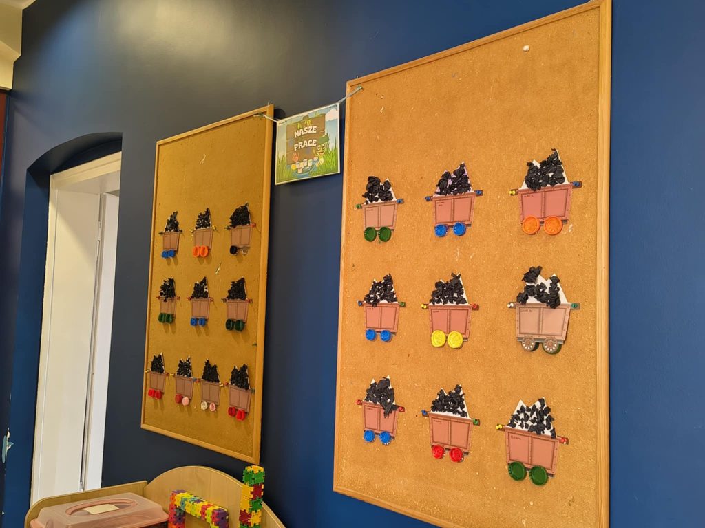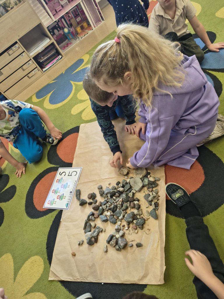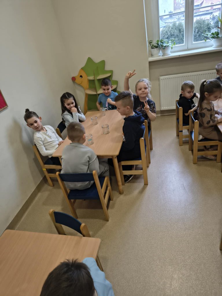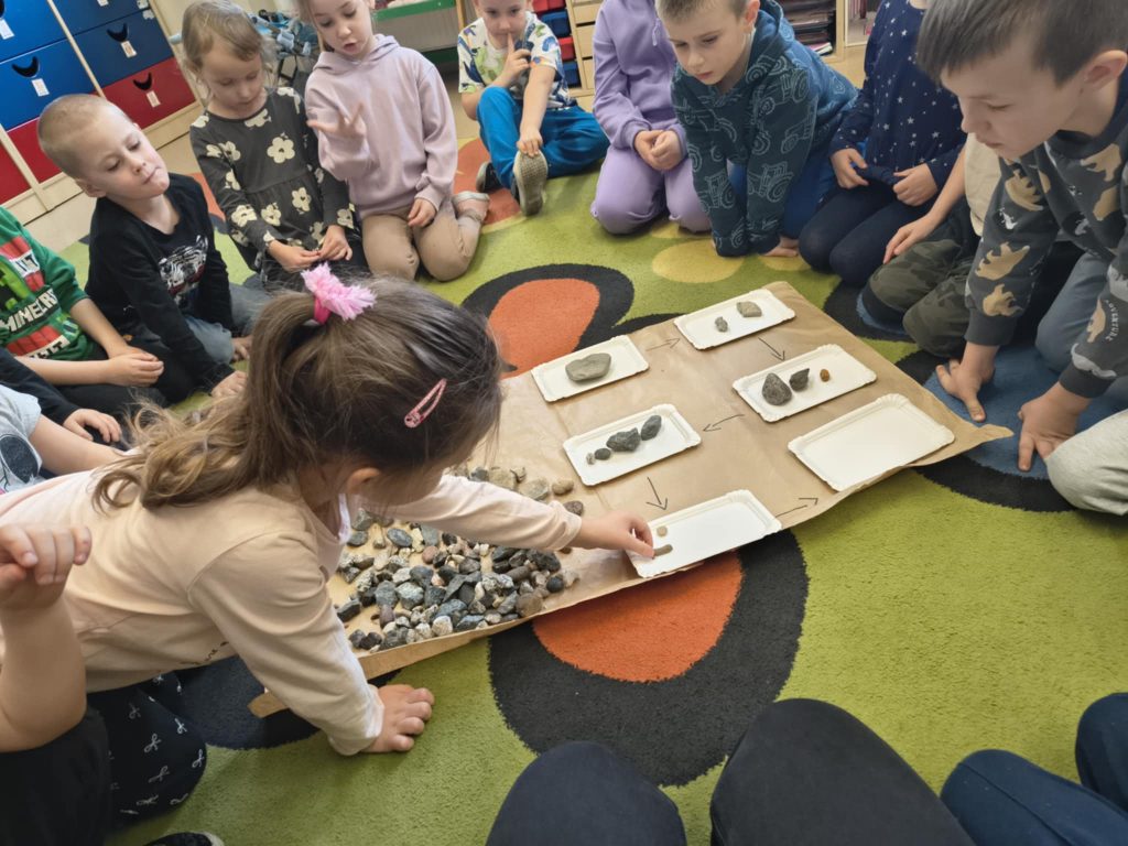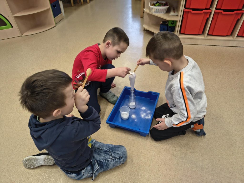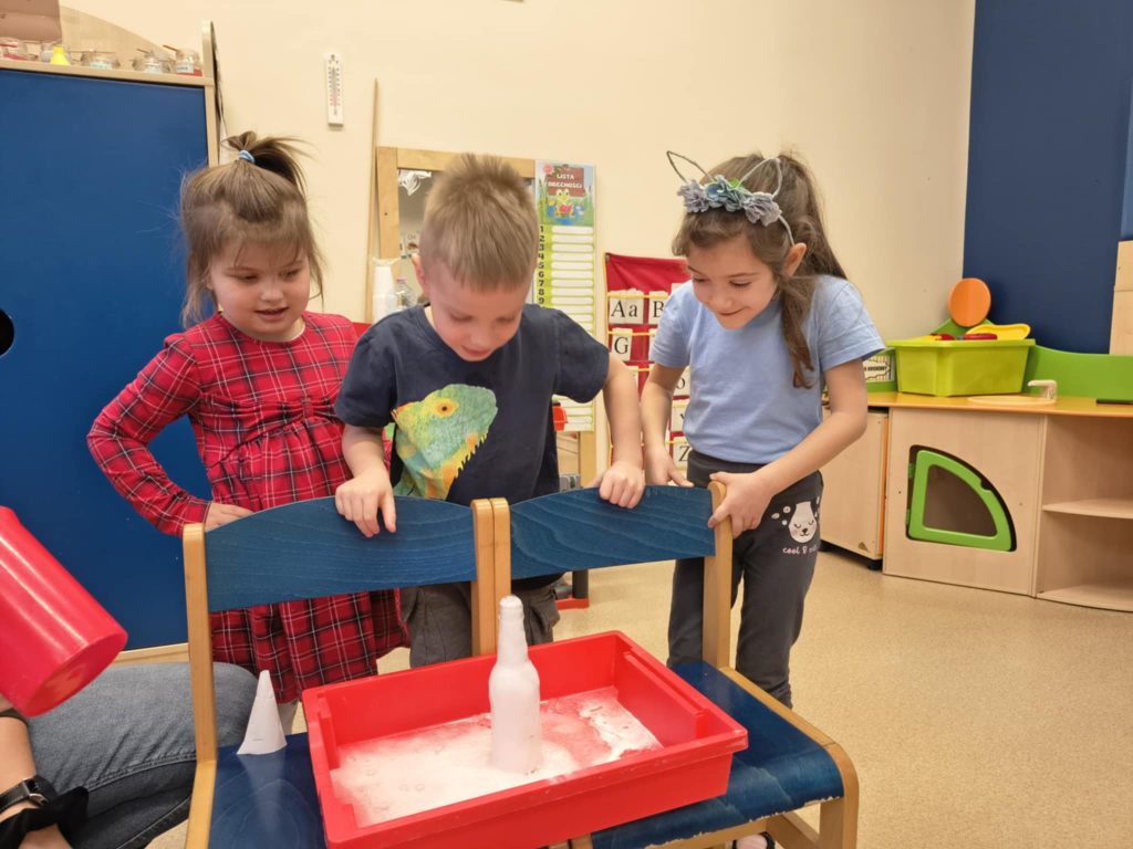 Żabki w minionym tygodniu realizowały temat: „Pod ziemią, pod wodą. Dzieci wyruszyły w fascynującą podróż do wnętrza Ziemi. Poznawaliśmy tajemnice naszej planety, jej bogactwa i niezwykłe zjawiska przyrodnicze. Przedszkolaki z dużym zainteresowaniem obserwowały proces krystalizacji soli, odkrywając, jak powstają kryształy. Dużo emocji wzbudził również temat wulkanów – dzieci dowiedziały się, jak działają i dlaczego wybuchają. Nie zabrakło także aktywności matematycznych – dzieci odwzorowywały cyfry przy użyciu kamieni, rozwijając przy tym sprawność manualną i umiejętność liczenia. Zajęcia łączyły naukę z zabawą, pobudzały ciekawość świata oraz zachęcały do samodzielnego odkrywania i eksperymentowania.
