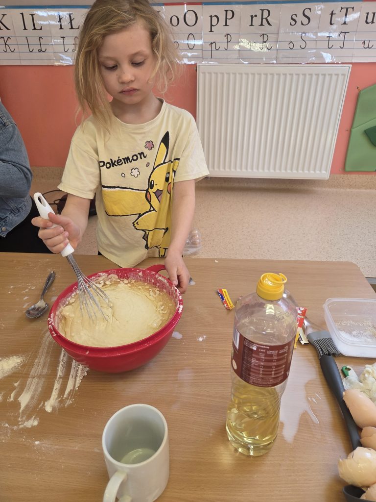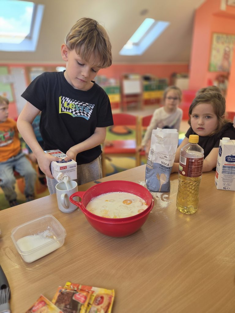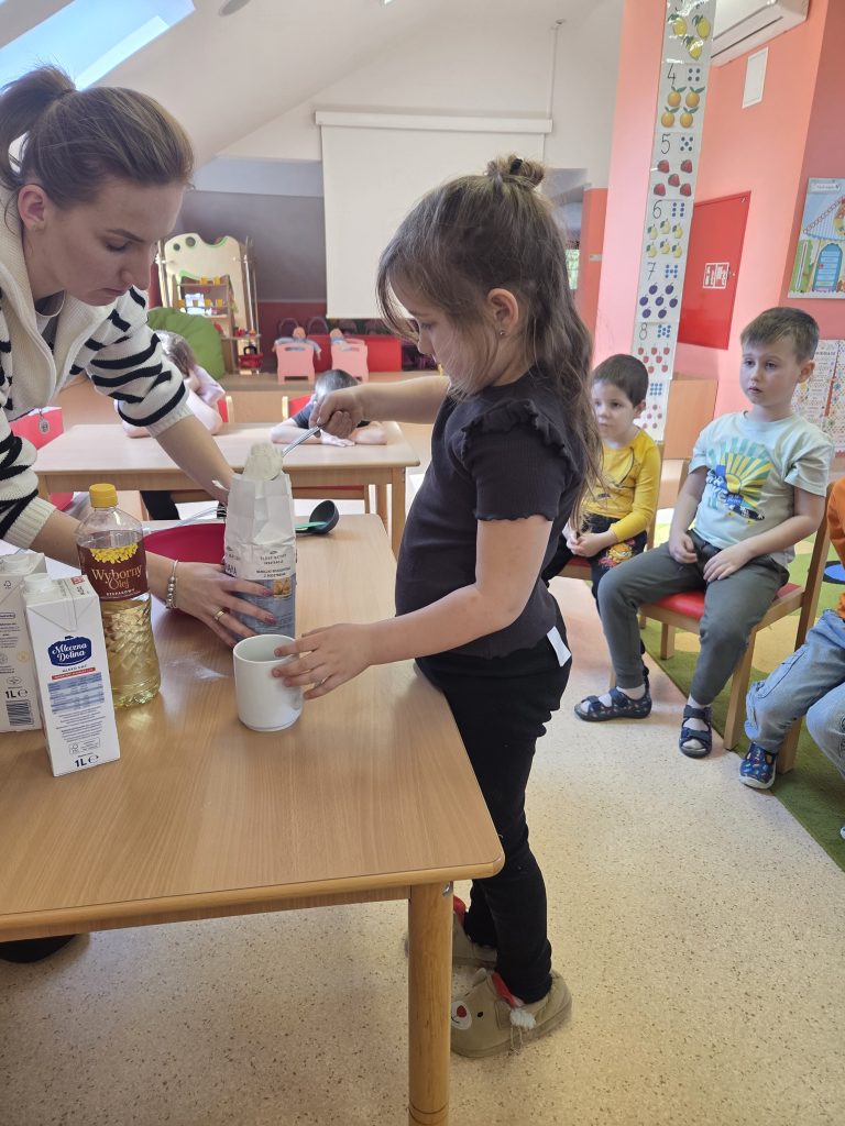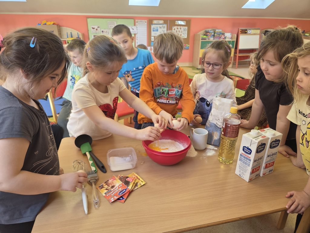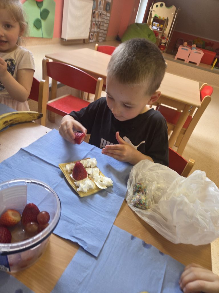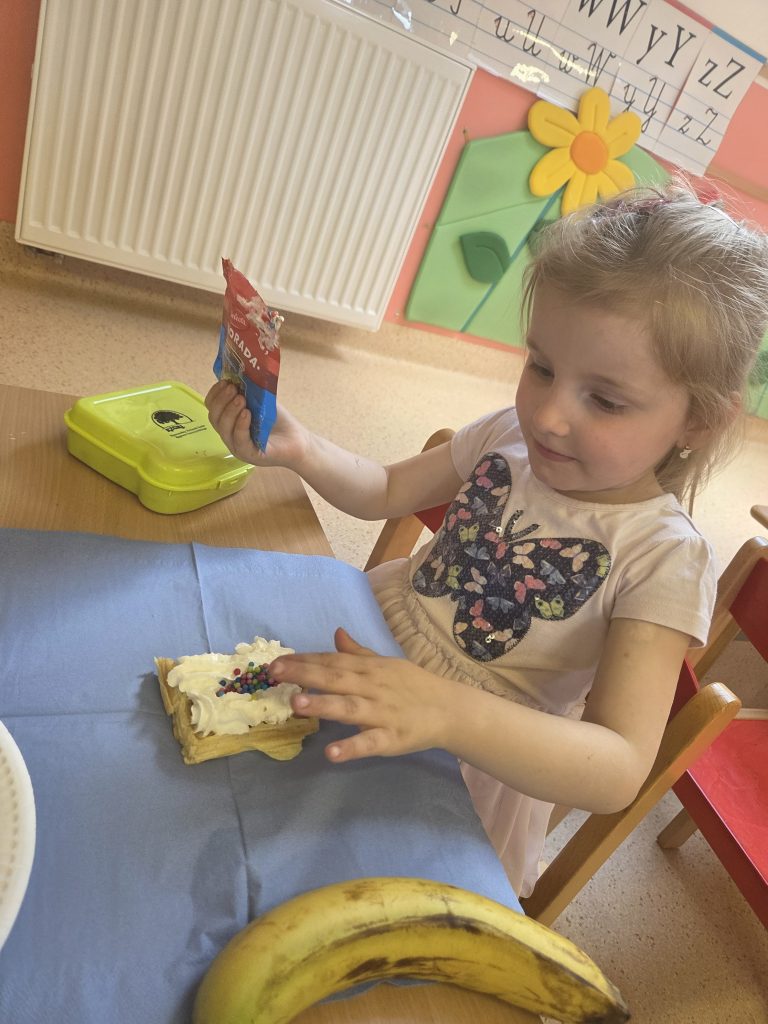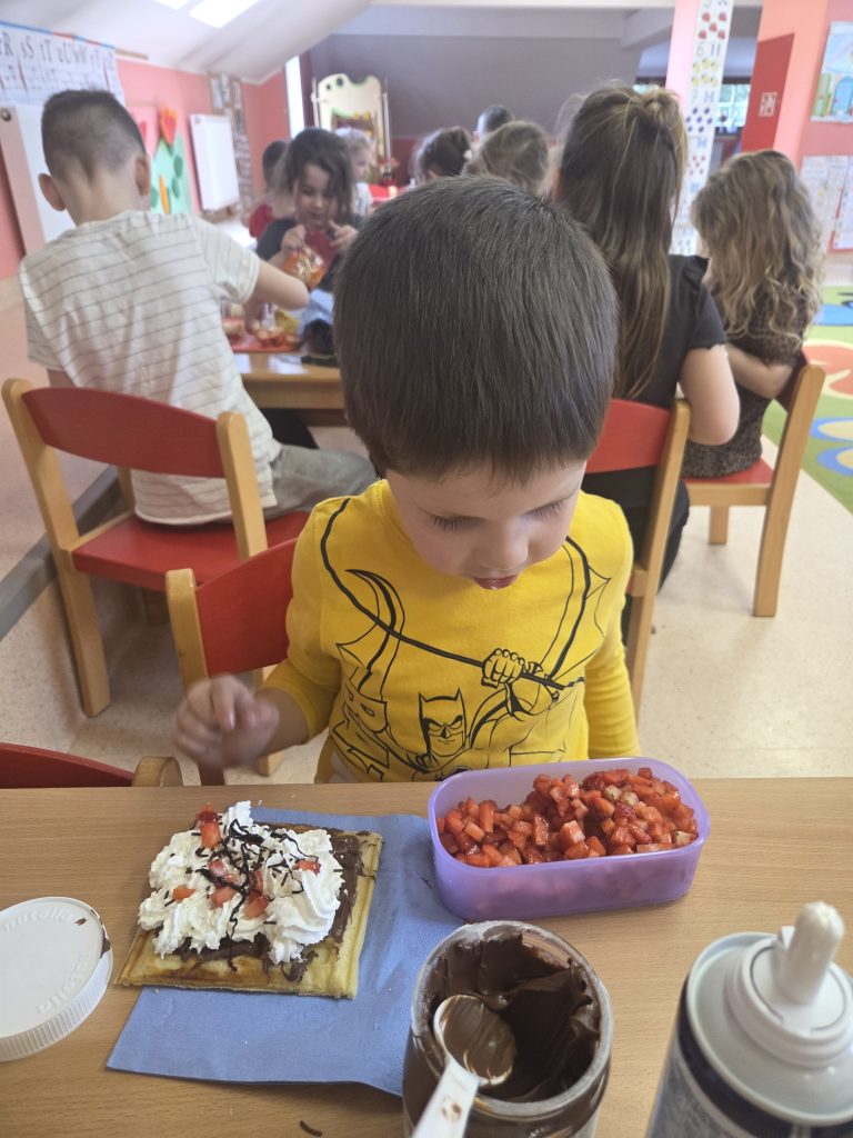 W grupie Pszczółki obchodziliśmy wyjątkowy i bardzo smaczny Dzień Gofra. Tego dnia w przedszkolu unosił się przepiękny zapach świeżo pieczonych gofrów, który wprawił wszystkich w doskonały nastrój.Dzieci poznały składniki potrzebne do przygotowania gofrów oraz kolejność ich wykonywania. Miały również okazję samodzielnie udekorować swoje gofry ulubionymi dodatkami – pojawiły się owoce, bita śmietana, cukier puder oraz kolorowe posypki.