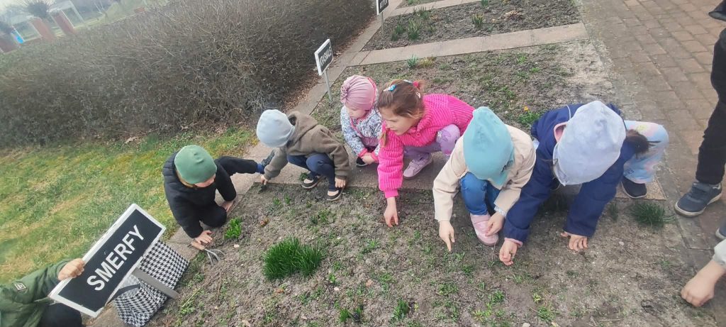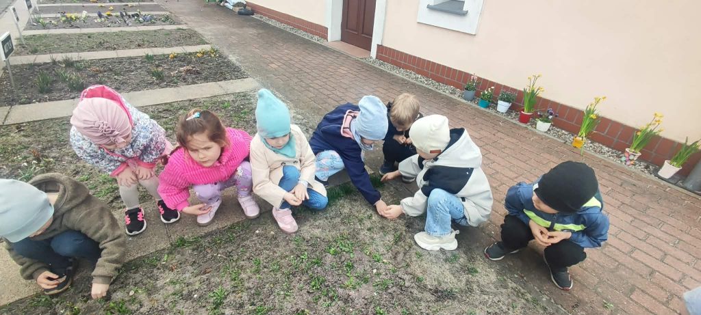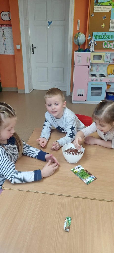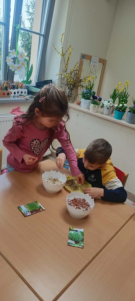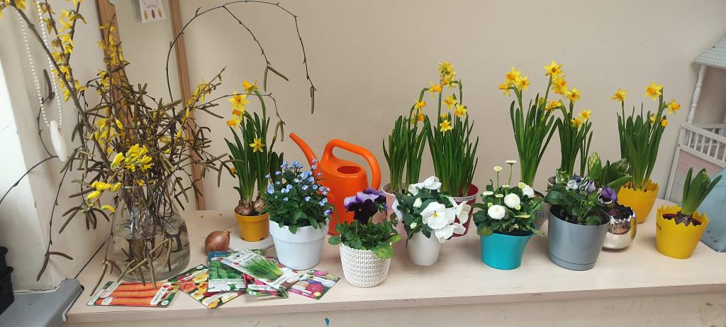 Pierwsze wiosenne dni były okazją do założenia kącika przyrodniczego . Podczas zajęć w sali dzieci siały nasiona, uczyły się ich pielęgnacji i obserwowały etapy wzrostu roślin. W ogródku dzieci miały okazję kopać, grabić i sadzić wiosenne kwiaty z doniczek do ziemi .