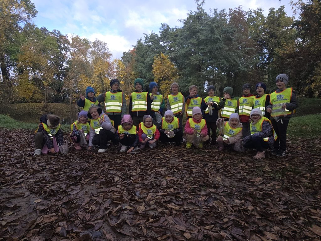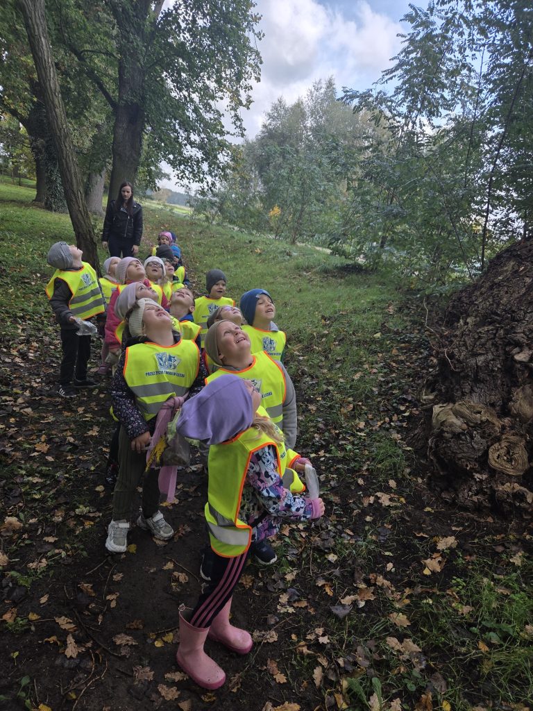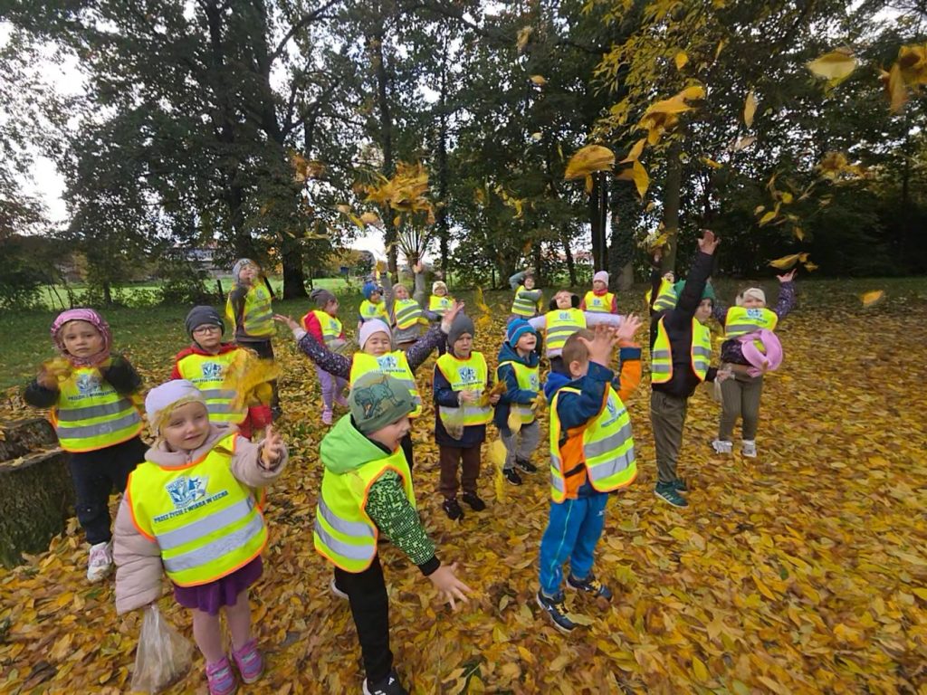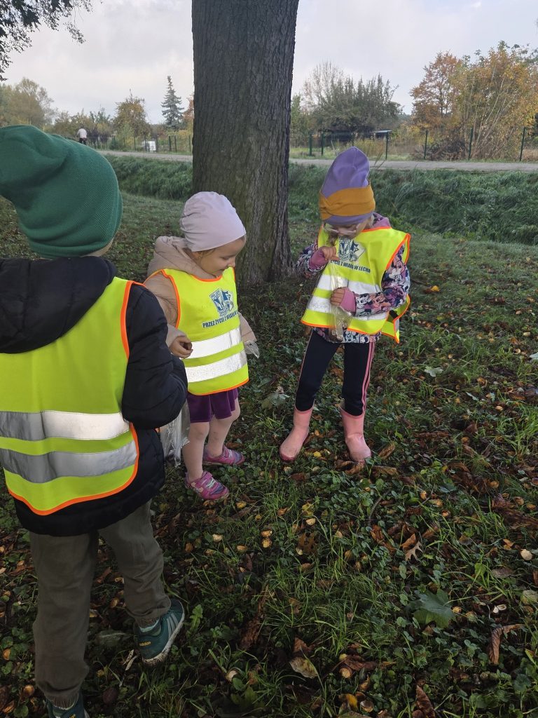 Dzieci z grupy Pszczółki wybrały się na spacer do pobliskiego parku. Podczas wyjścia obserwowały zmiany zachodzące w przyrodzie jesienią – podziwiały kolorowe liście, spadające kasztany i żołędzie oraz słuchały odgłosów natury. Przedszkolaki z ciekawością zbierały jesienne skarby, które wykorzystają do prac plastycznych w przedszkolu.