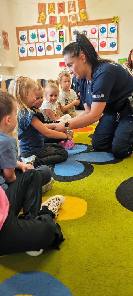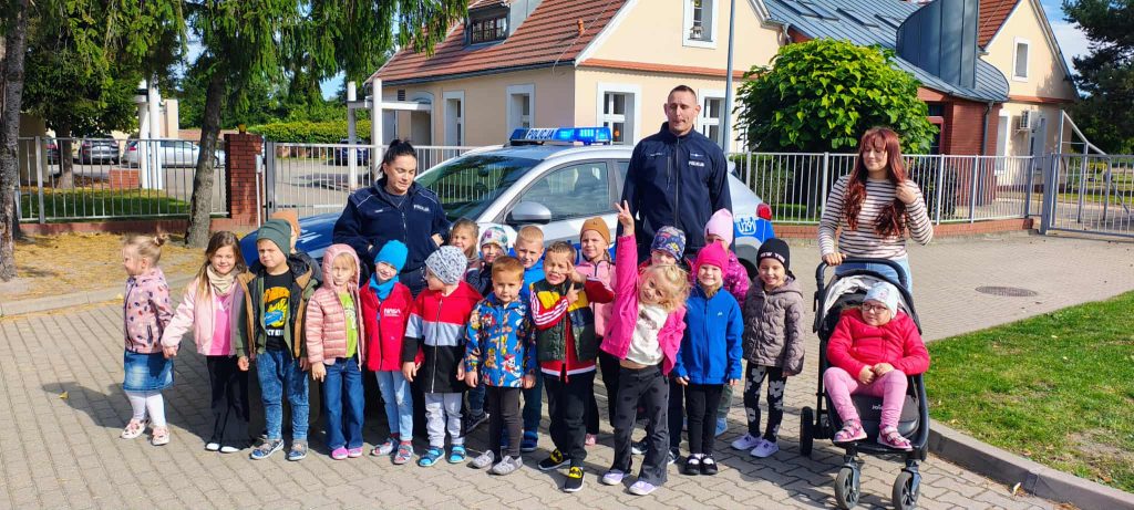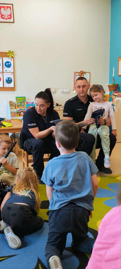 Do grupy Motylki w ostatnim czasie zawitali niezwykli goście- policjanci. Spotkanie miało na celu przypomnienie zasad bezpiecznego poruszania się w drodze do przedszkola i z przedszkola. Dzieci miały okazję bliżej przyjrzeć się przedmiotom, które na co dzień w swojej pracy wykorzystują a także z bliska zobaczyć radiowóz policyjny. Dziękujemy bardzo za ciekawe spotkanie.