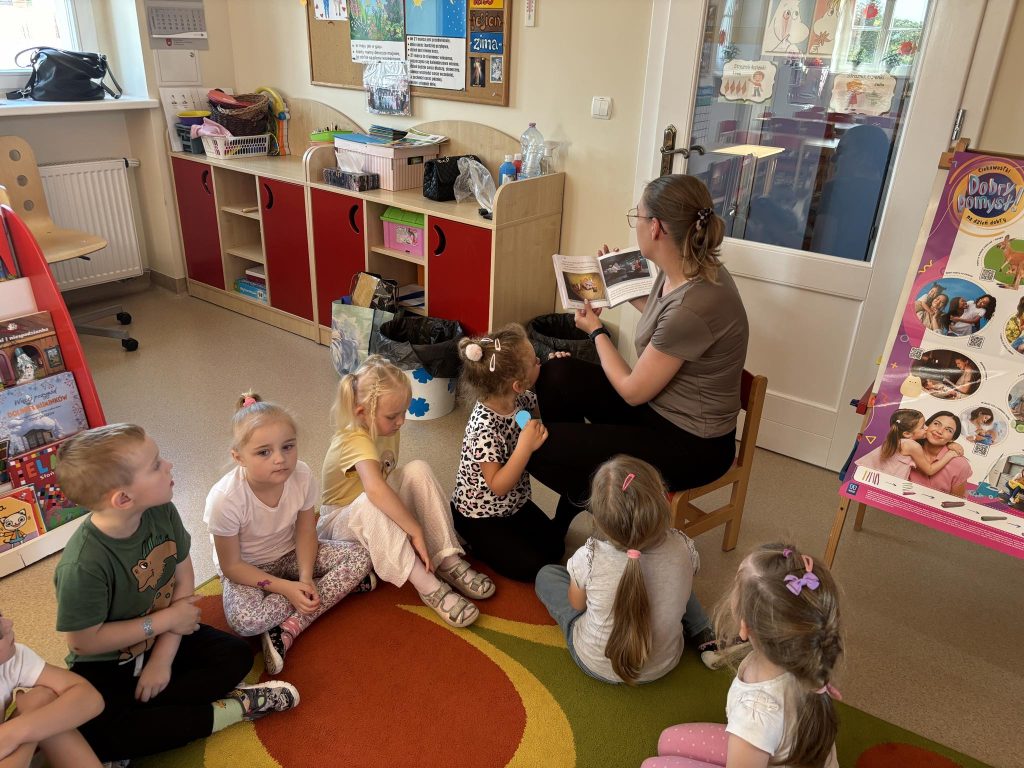 We wtorek na czytaniu gościliśmy mamę Emilki – panią Weronikę. Dzieci z zainteresowaniem wysłuchały przygód Słonika Dumbo oraz Zakochany Kundel. Dziękujemy Pani Weronice za spotkanie z książką oraz za niespodzianki dla dzieci.