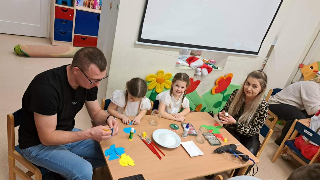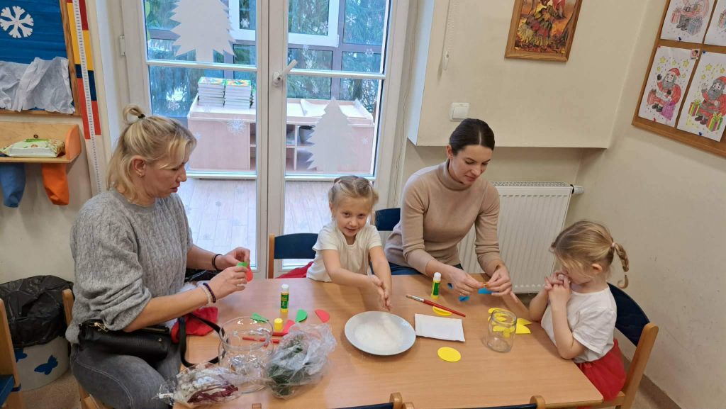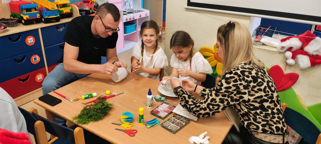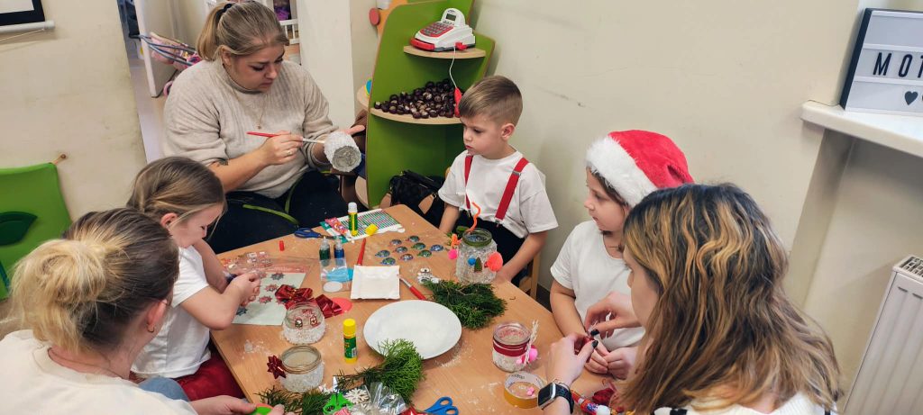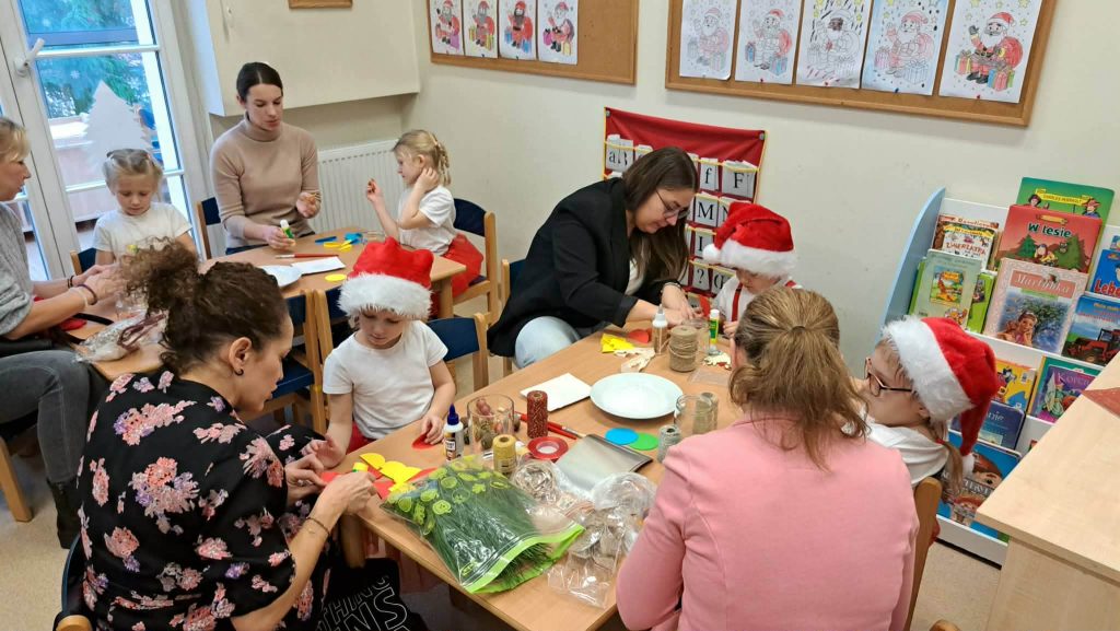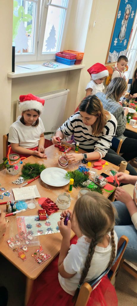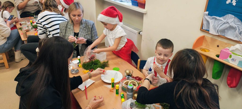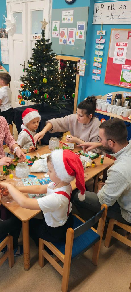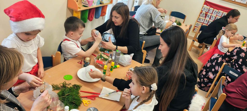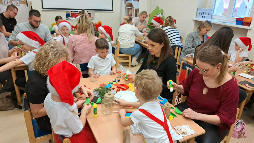 W naszym przedszkolu odbyły się świąteczne warsztaty z udziałem rodziców i dzieci z grupy Motylki. Na początek dzieci zaprezentowały swoim najbliższym występ mikołajkowy Następnie wspólnie z bliskimi tworzyły ozdoby świąteczne- papierowe bombki oraz lampiony, rozwijając kreatywność i czerpiąc radość ze wspólnie spędzonego czasu. Spotkanie przebiegło w miłej, ciepłej atmosferze i wprowadziło wszystkich w świąteczny nastrój.