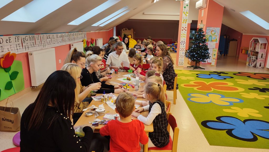 2 grudnia w naszej sali zagościła świąteczna atmosfera. Po raz pierwszy odbyły się warsztaty, na które zaprosiliśmy rodziców. Celem spotkania było wspólne wykonanie ozdób świątecznych, a także zaprezentowanie umiejętności wokalno-instrumentalnych przez dzieci. Przedszkolaki wraz ze swoimi rodzicami stworzyli wyjątkowe i niepowtarzalne ozdoby. Był to mile spędzony czas ! Serdecznie dziękujemy wszystkim za przybycie !
