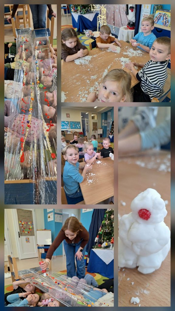 W grupie Kubusie zrobiło się tego dnia jak w małym laboratorium marzeń. Mama Liwki rozwinęła nad dziećmi wielką, połyskującą folię, która zawisła nad nimi niczym niebo gotowe na przygodę. Maluchy położyły się pod nią, a świat zaczął sypać niespodziankami.Najpierw spadł puch zrobiony ze sztucznego śniegu, cichy i figlarny ❄️. Potem pojawiły się krople wody, które tańczyły na folii jak wesołe paciorki deszczu. Za chwilę posypały się kolorowe, miękkie kuleczki, odbijające się delikatnie i tworzące wirujące tęczowe chmurki. Z góry zjeżdżały kolejne materiały, każdy o innym dźwięku, fakturze i temperamencie.Dzieciaki chłonęły to wszystko szeroko otwartymi oczami. Warsztaty zmieniły się w sensoryczną opowieść, w której mali odkrywcy mogli po prostu leżeć, patrzeć i czuć, jak świat eksperymentów spływa na nich niczym barwna, łagodna kaskada.