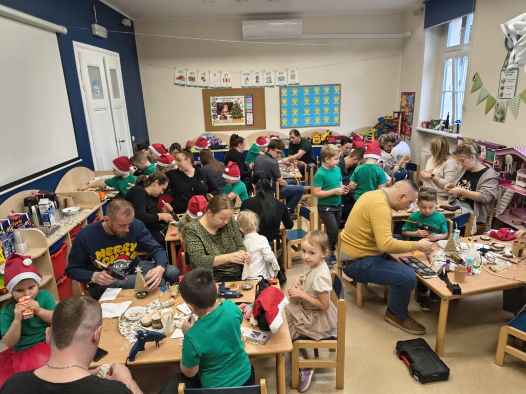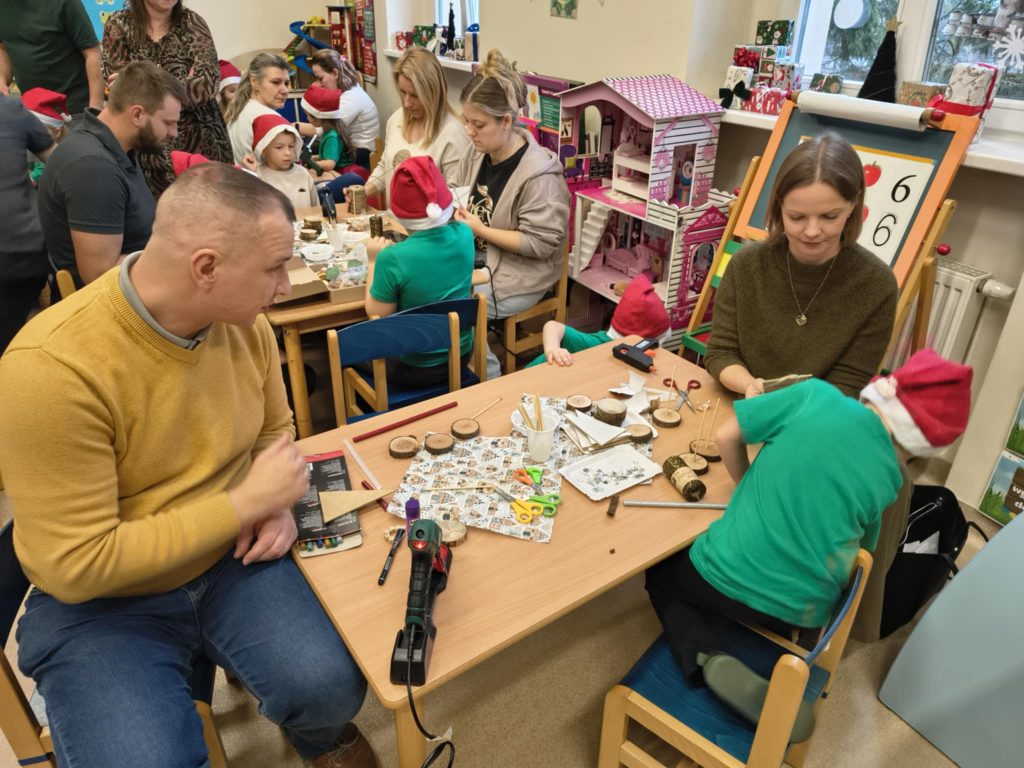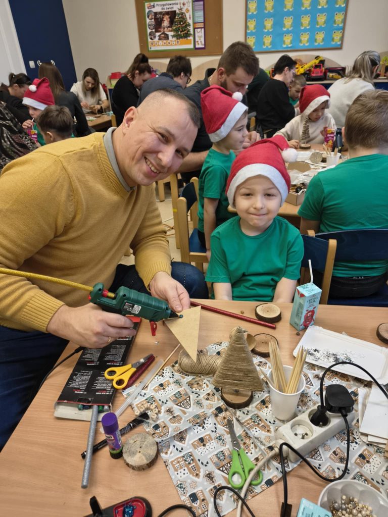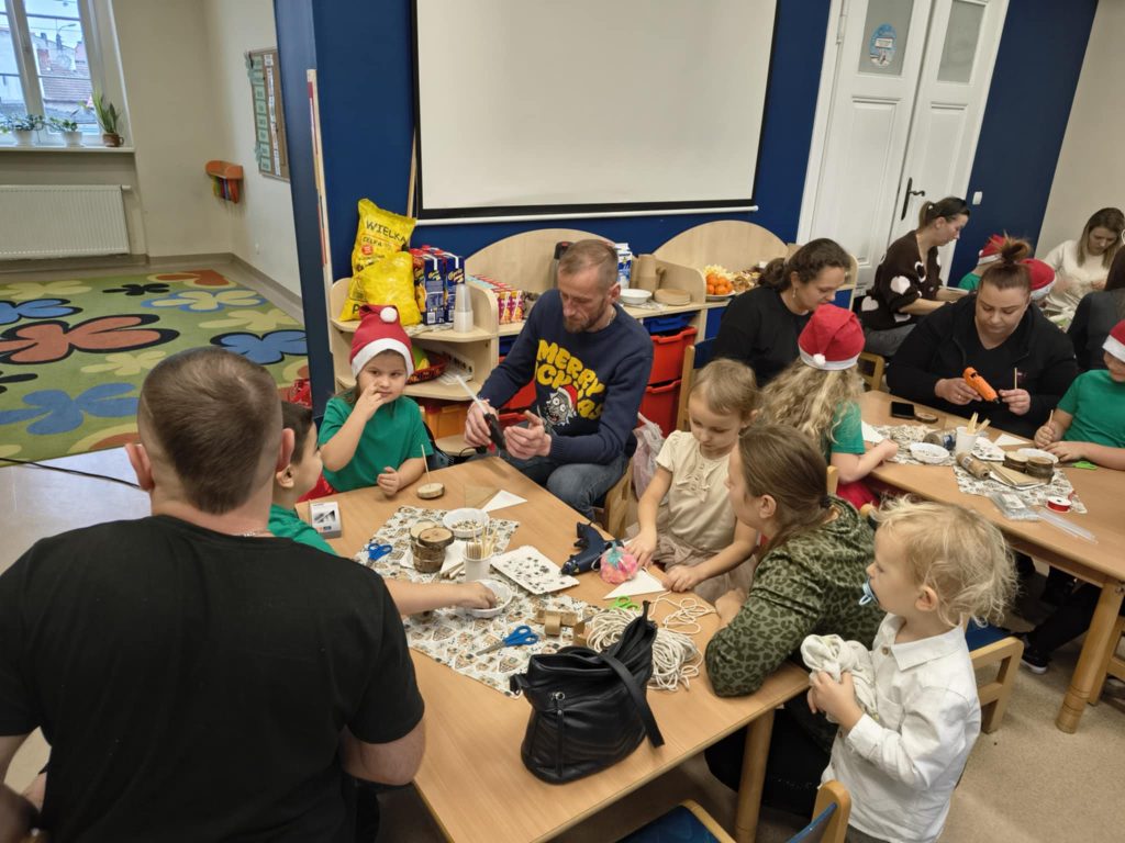 W grudniu dzieci z grupy „Żabki” spotkały się na warsztatach bożonarodzeniowych z rodzicami. Wspólnie wykonaliśmy świąteczne choinki ze sznurka jutowego i drewna. Spotkaniu towarzyszył miły poczęstunek oraz muzyczny występ „Żabek”, który wprowadził wszystkich w świąteczny nastrój.