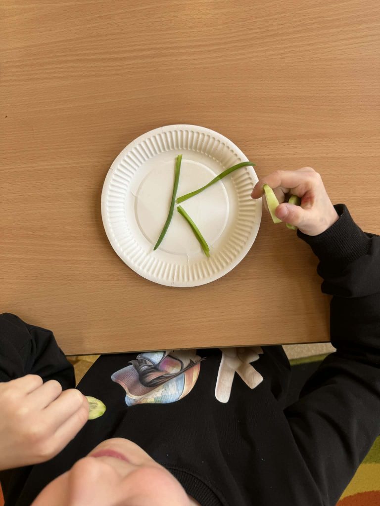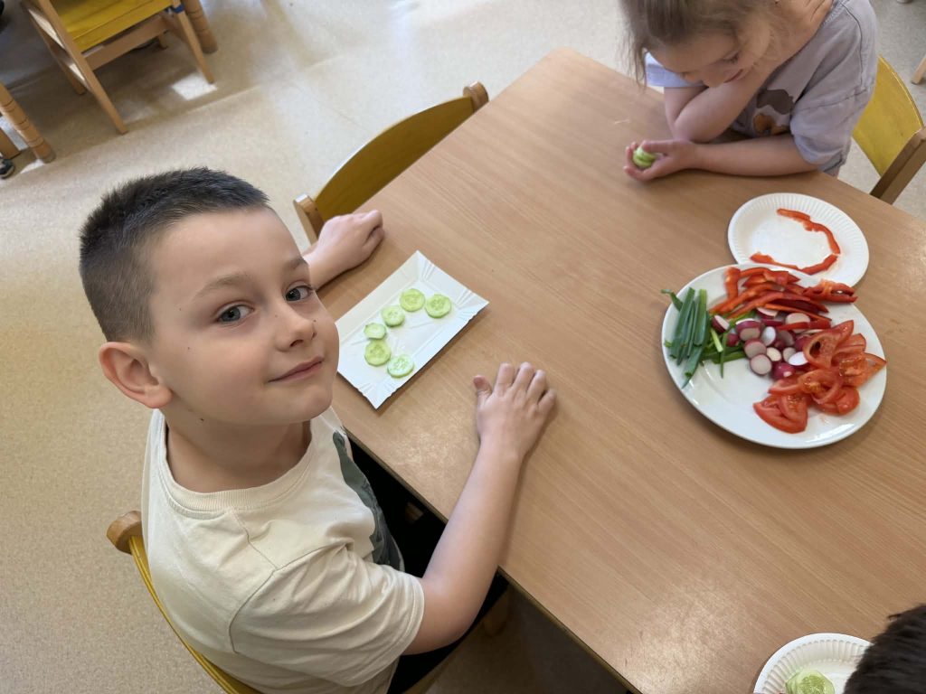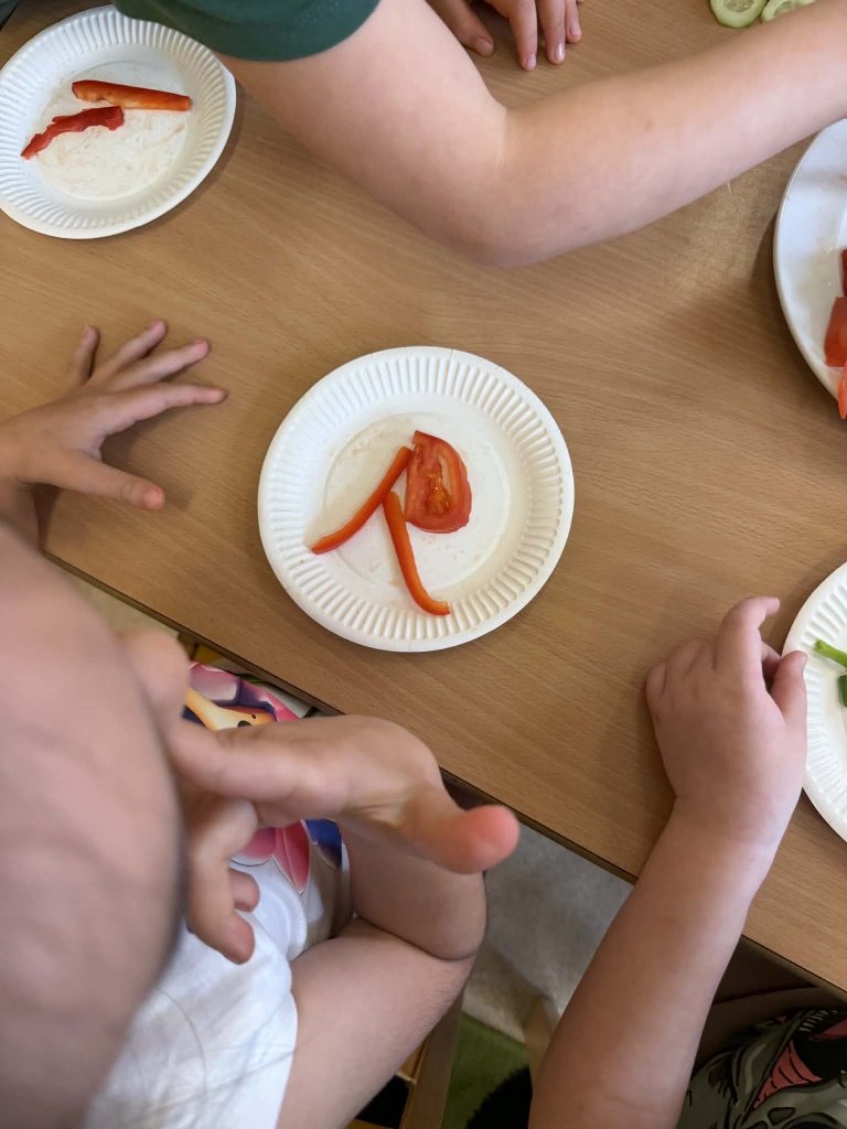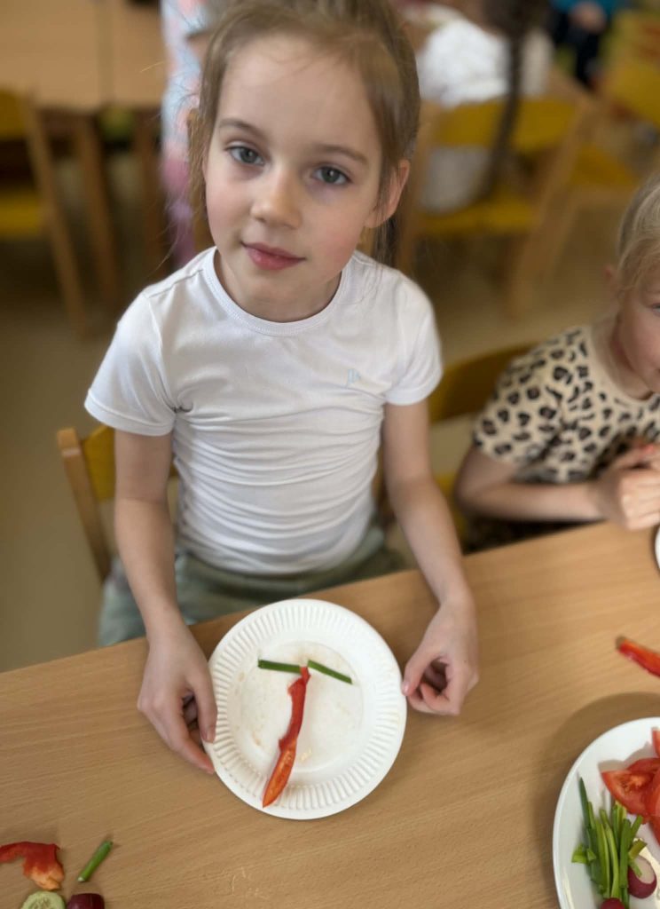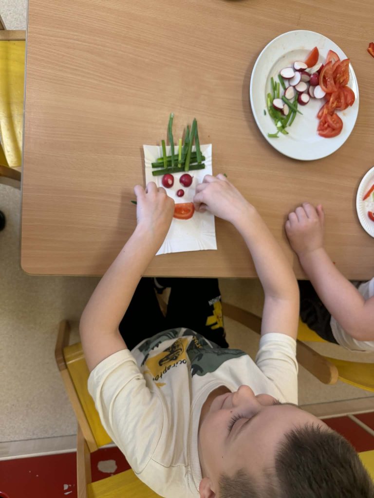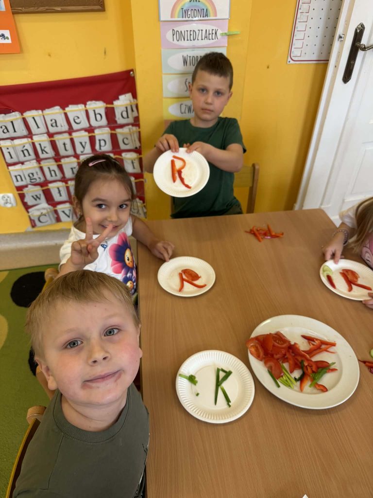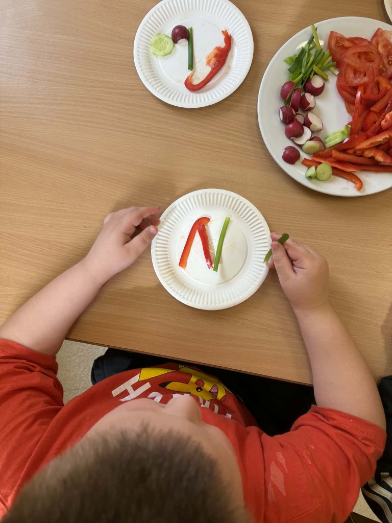 Krasnale podsumowując temat „Wiosenne zdrowie” układały z warzyw różne kompozycje, rozwijając tym swoją kreatywność oraz świadomość zdrowego odżywania a także dodatkowo utrwalały poznane literki, łącząc naukę ze świetną zabawą.
