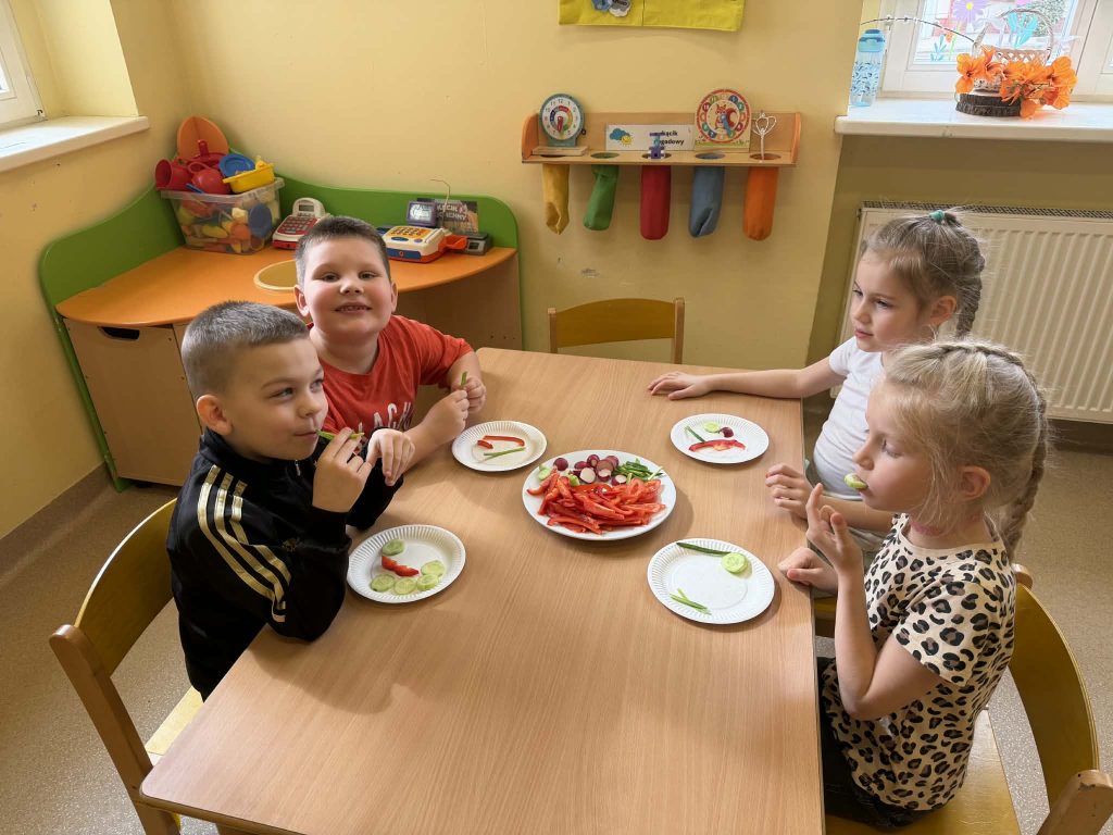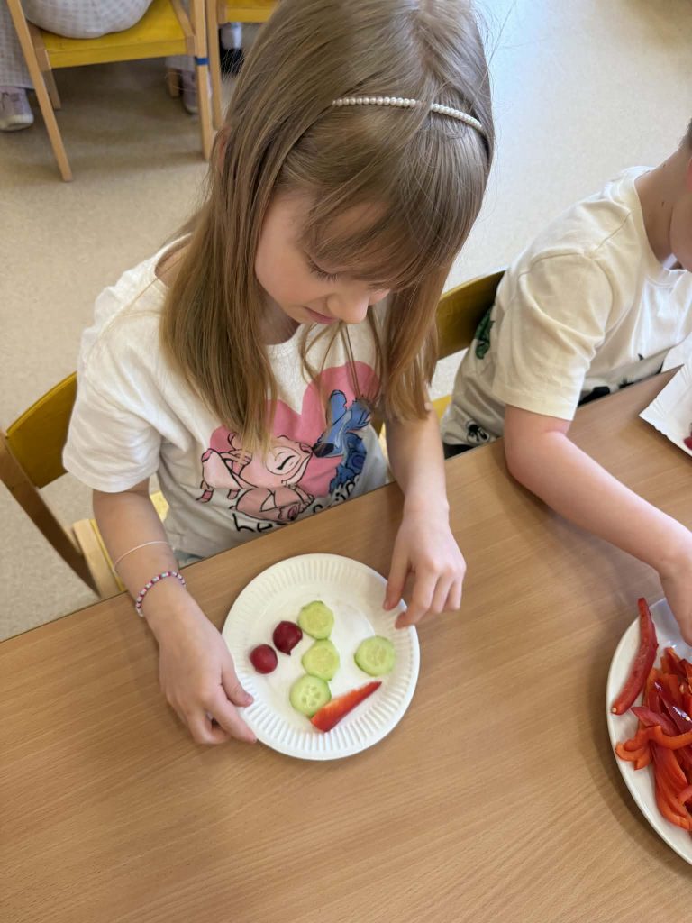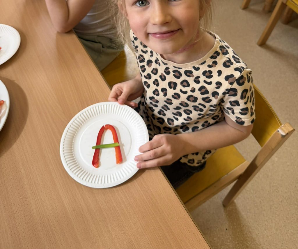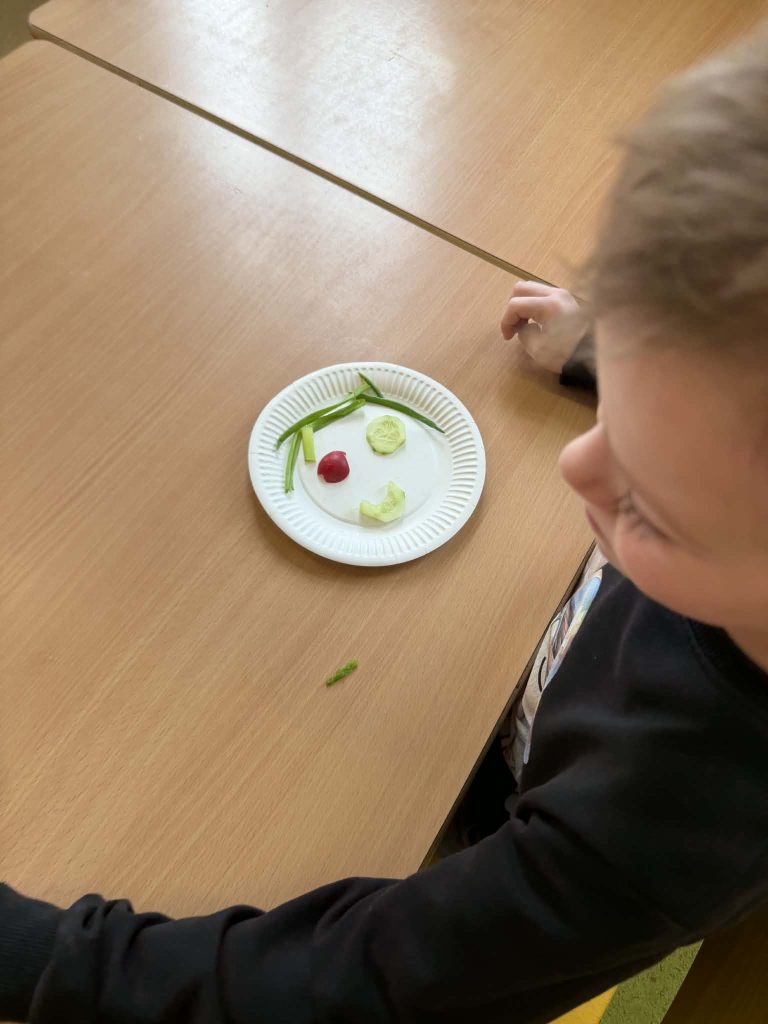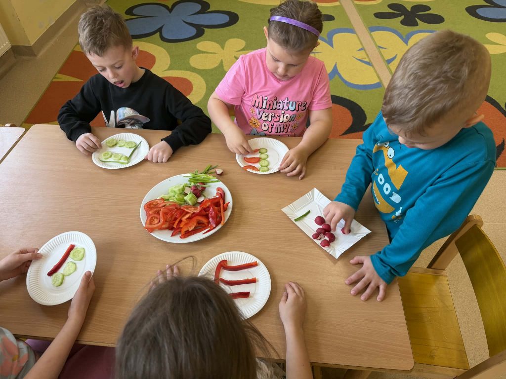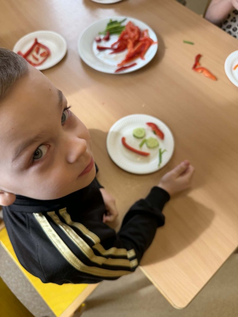 Krasnale podsumowując temat „Wiosenne zdrowie” układały z warzyw różne kompozycje, rozwijając tym swoją kreatywność oraz świadomość zdrowego odżywania a także dodatkowo utrwalały poznane literki, łącząc naukę ze świetną zabawą.