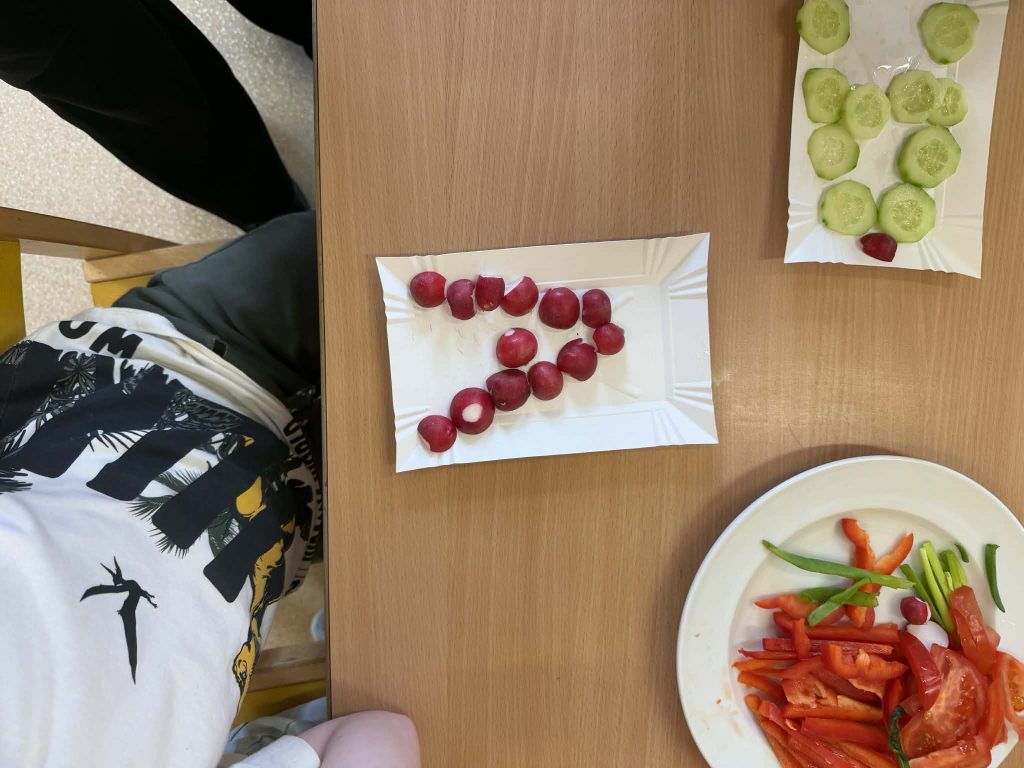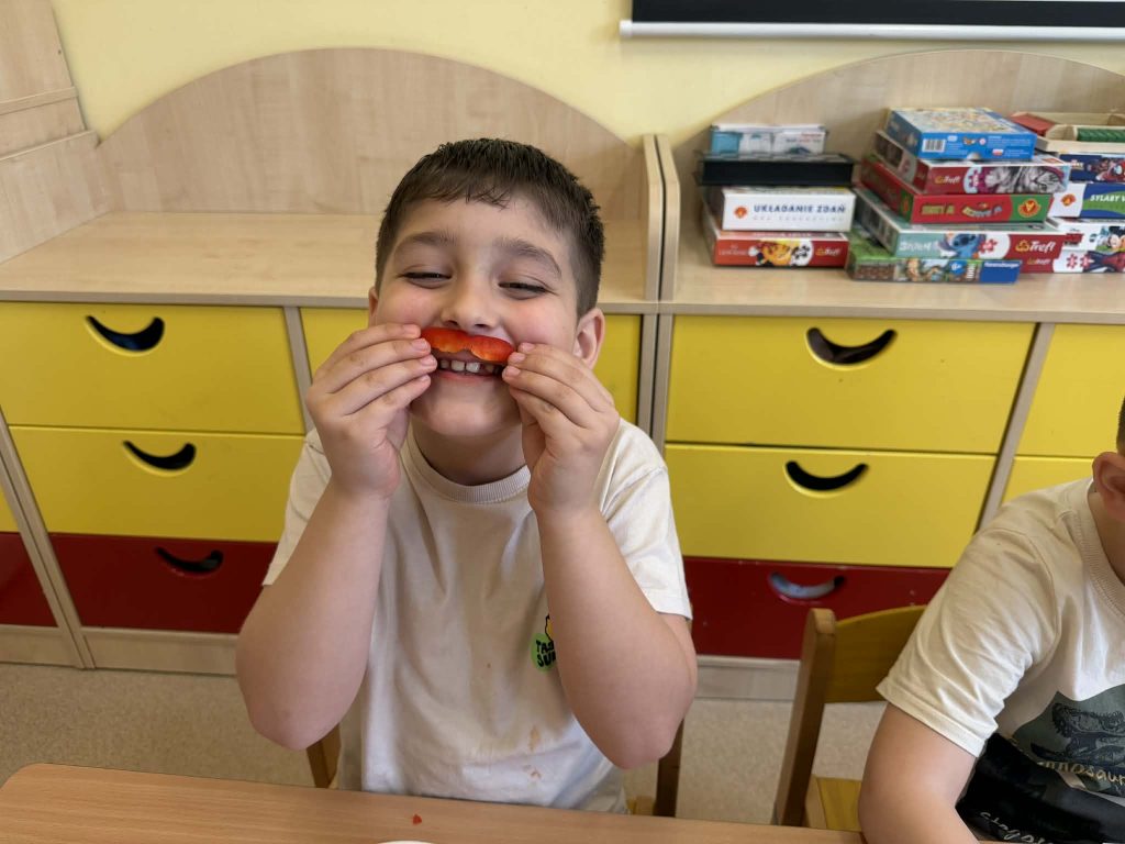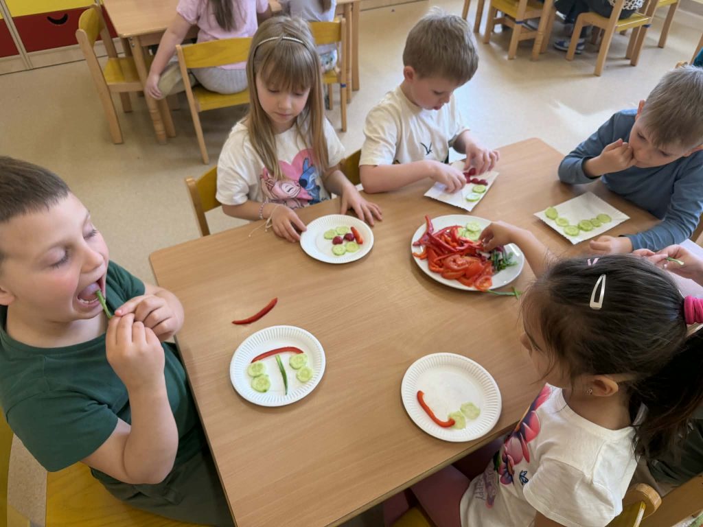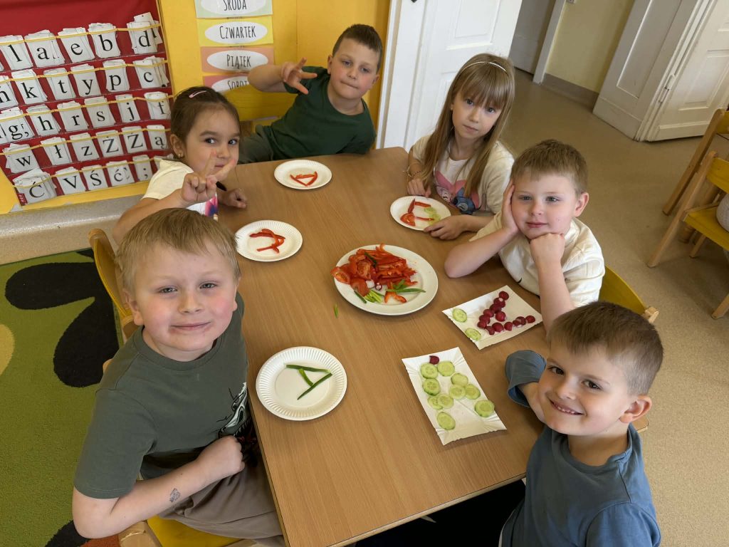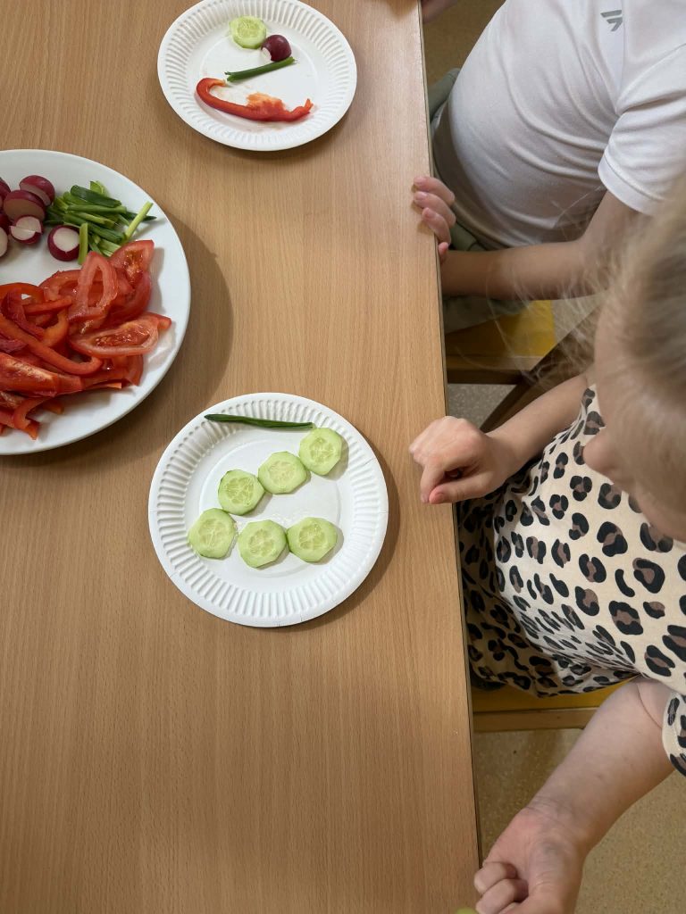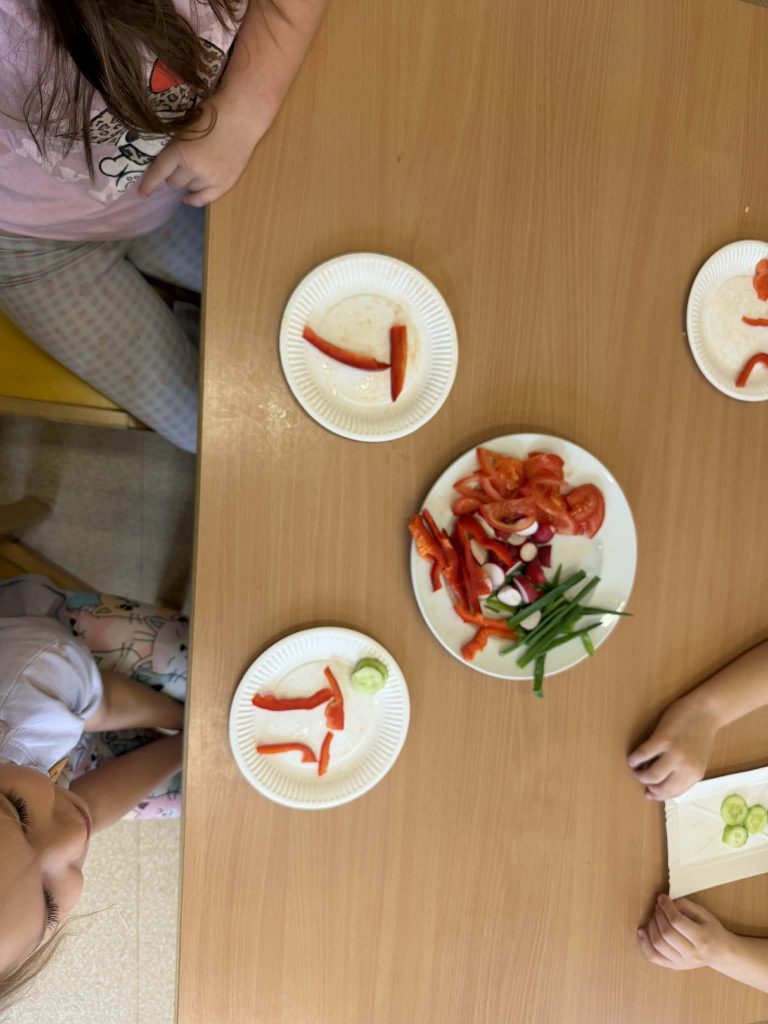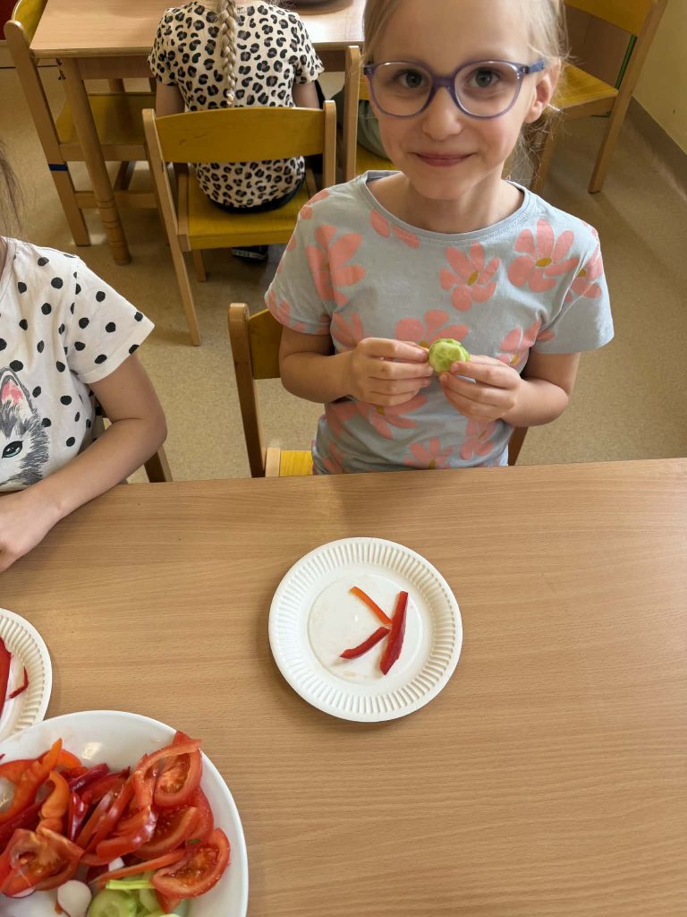 Krasnale podsumowując temat „Wiosenne zdrowie” układały z warzyw różne kompozycje, rozwijając tym swoją kreatywność oraz świadomość zdrowego odżywania a także dodatkowo utrwalały poznane literki, łącząc naukę ze świetną zabawą.