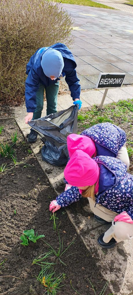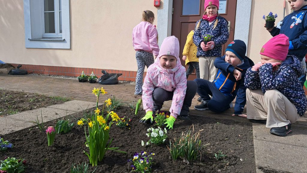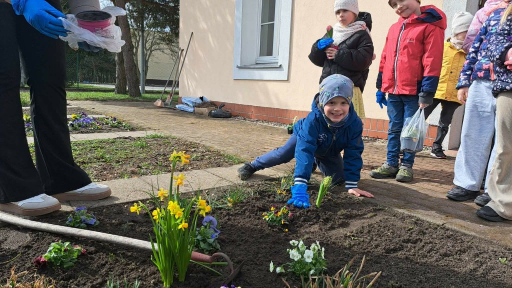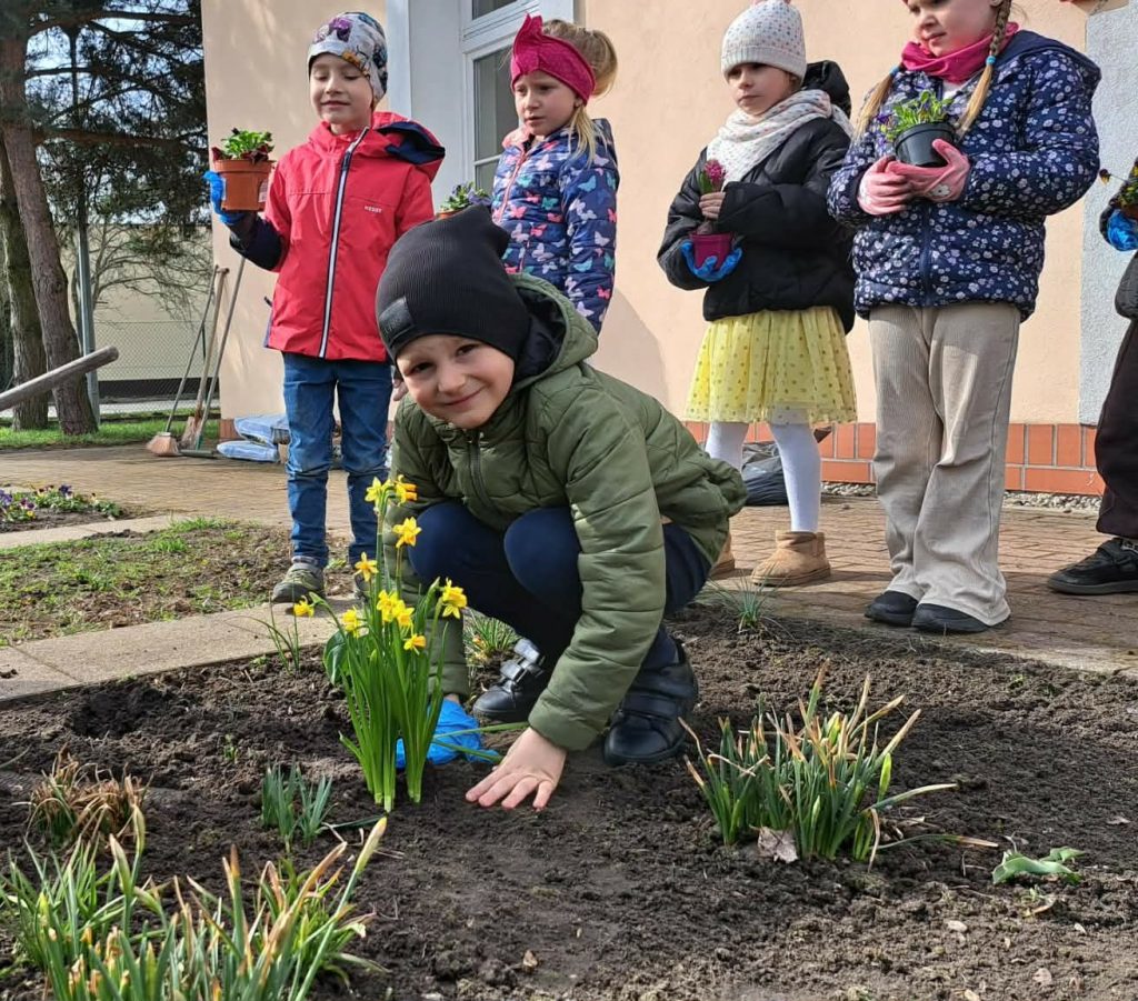 Wraz z nadejściem wiosny dzieci z grupy Motylki uczestniczyły w pracach w ogródku przedszkolnym. Porządkowały rabatki oraz sadziły wiosenne kwiaty, takie jak stokrotki, żonkile, hiacynty i bratki. Zajęcia były doskonałą okazją do nauki dbania o przyrodę, współpracy oraz obserwowania wzrostu roślin.