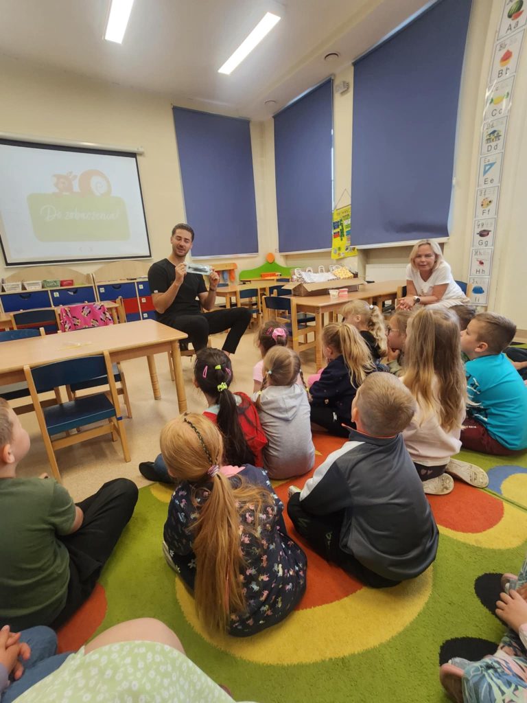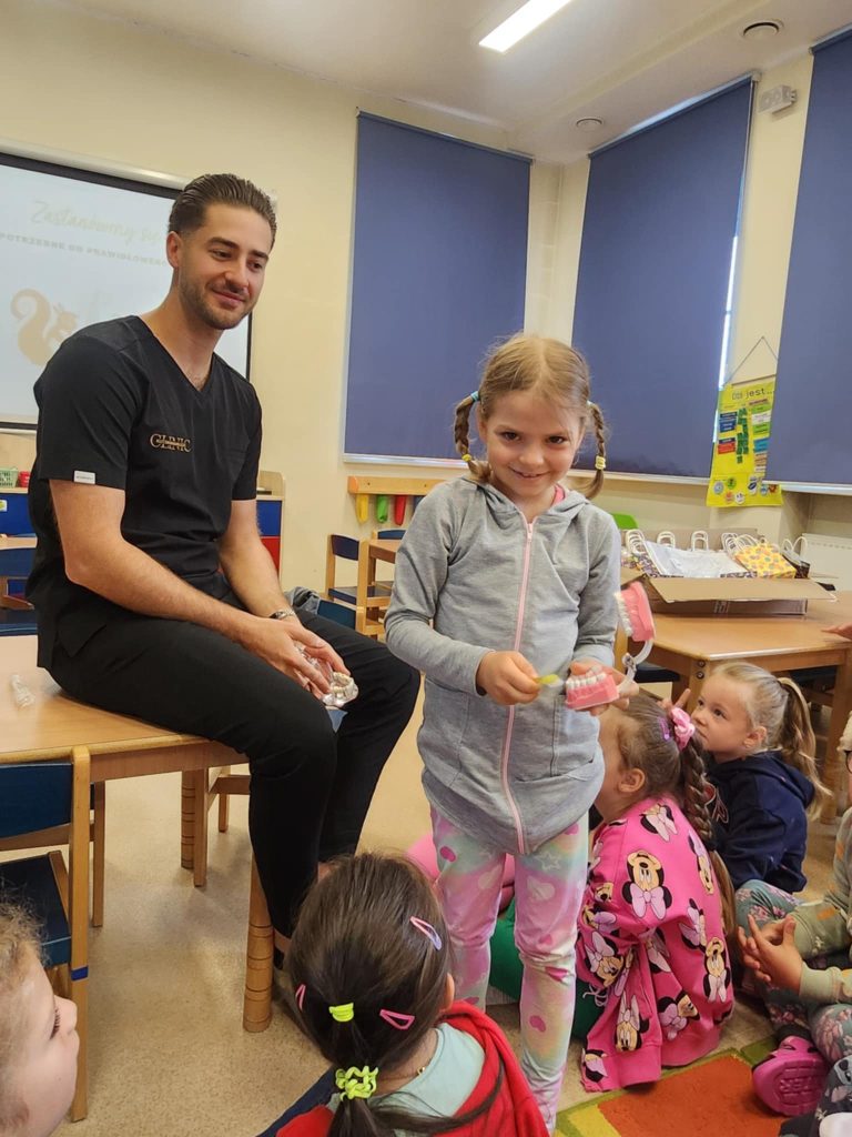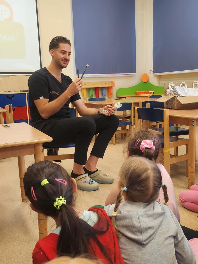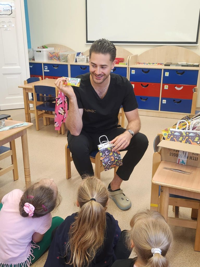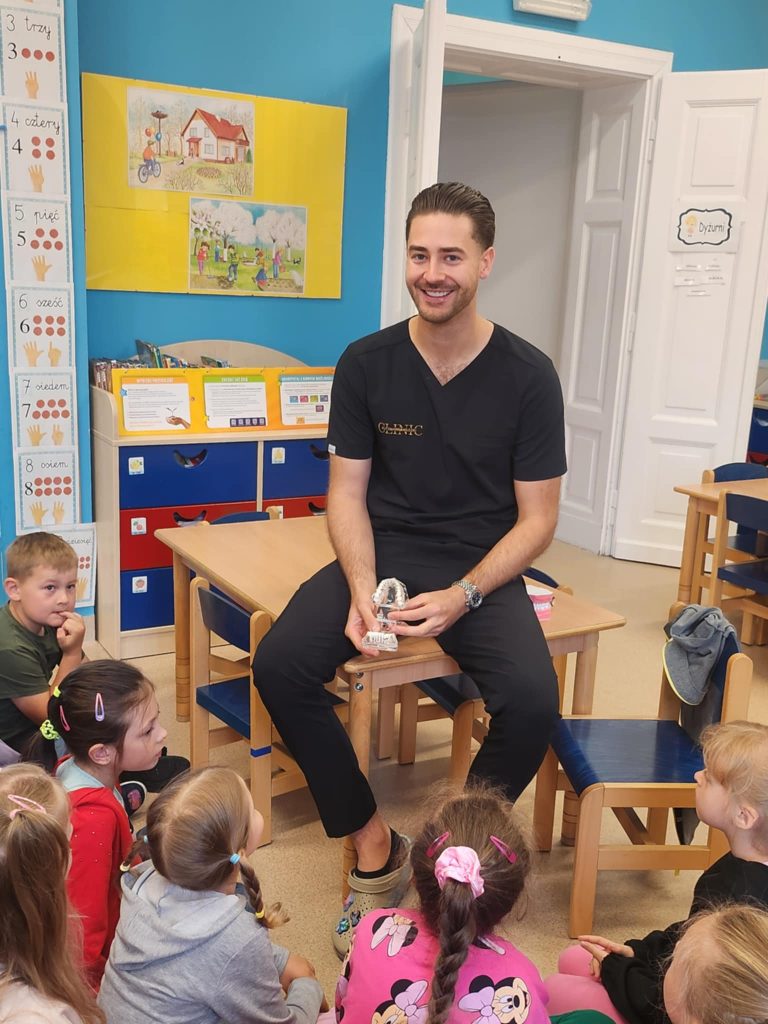 W poniedziałek 16.06.2025, grupę „Kubusie” odwiedził wyjątkowy gość – stomatolog z KUTZMANN&MILECKI CLINIC Spotkanie było nie tylko bardzo ciekawe, ale też pełne uśmiechu i radości! Pan stomatolog opowiedział dzieciom o swojej pracy, pokazał narzędzia, których używa w gabinecie, oraz wytłumaczył, jak dbać o zęby, by były zdrowe i mocne. Maluchy miały okazję dowiedzieć się, czego nie należy jeść, by ząbki były szczęśliwe. Jedną z największych atrakcji był pokaz prawidłowego szczotkowania zębów na specjalnym modelu szczęki. Dzieci chętnie odpowiadały na pytania. Mogły same poćwiczyć, jak prawidłowo myć zęby. Na zakończenie każdy przedszkolak otrzymał drobny upominek. Serdecznie dziękujemy panu stomatologowi za wizytę i cenną lekcję dbania o zdrowie jamy ustnej!