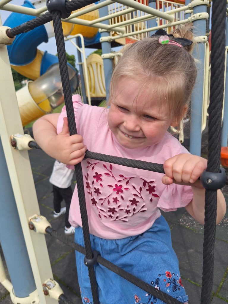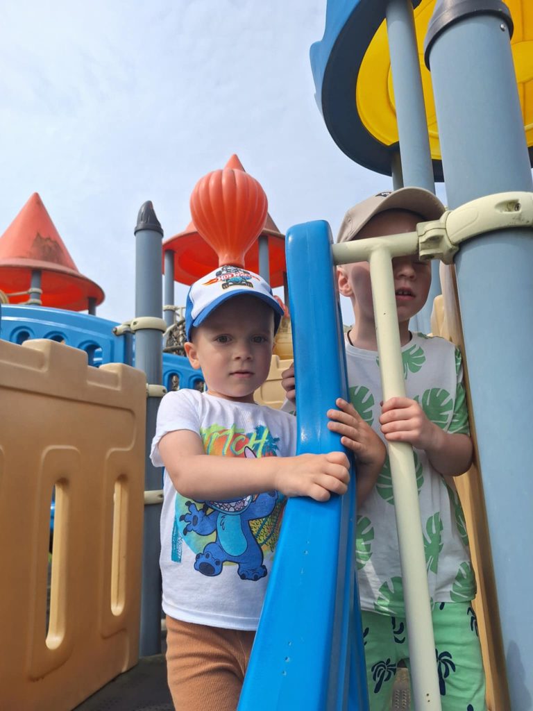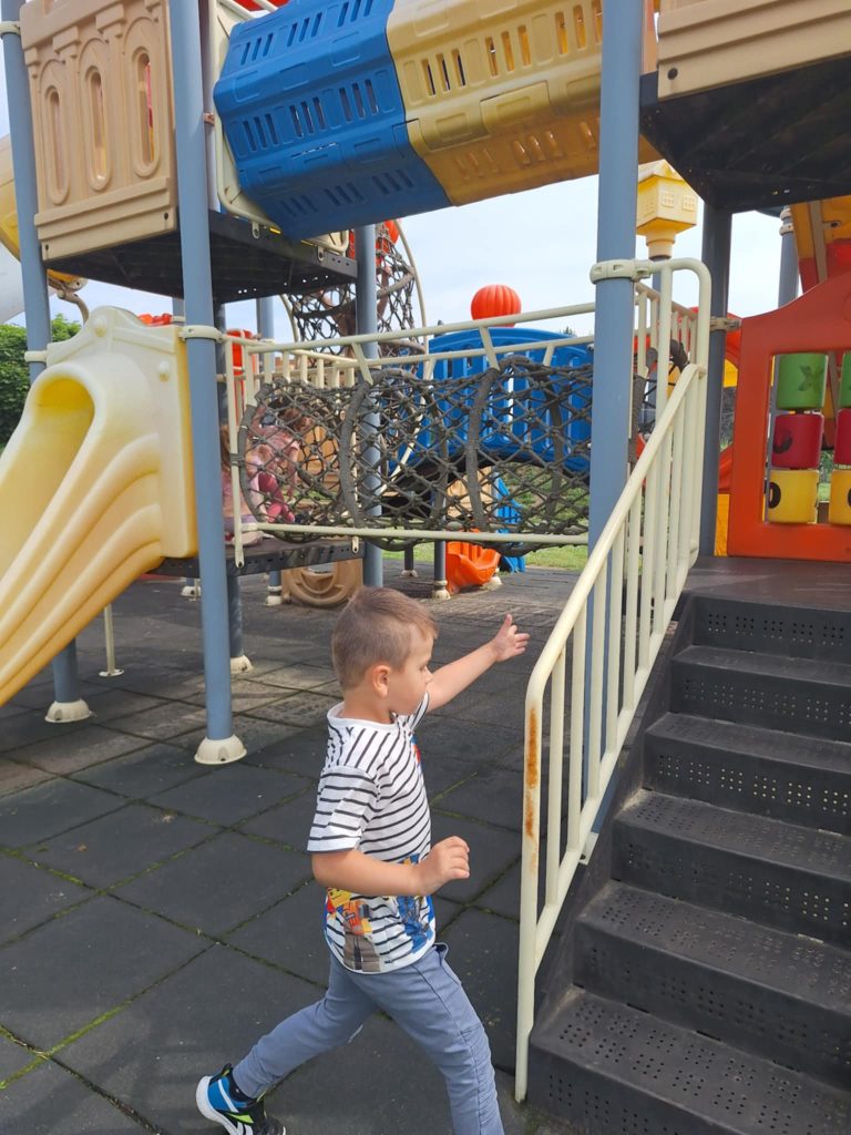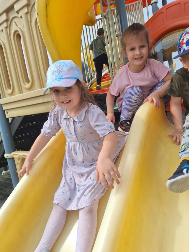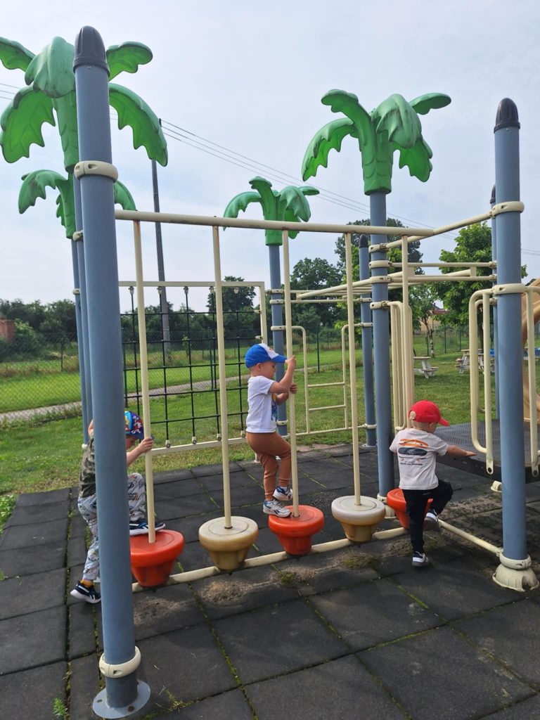 Zabawy Smerfików na placu zabaw Cofnij Słońce za oknem, więc „Smerfiki” korzystają z przedszkolnego placu zabaw, na którym zawsze jest fajnie! Radość dzieci bezcenna..