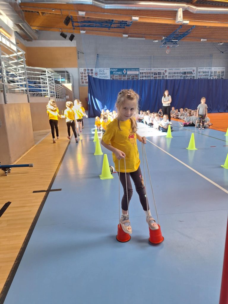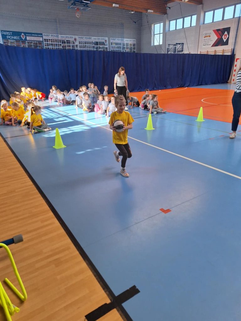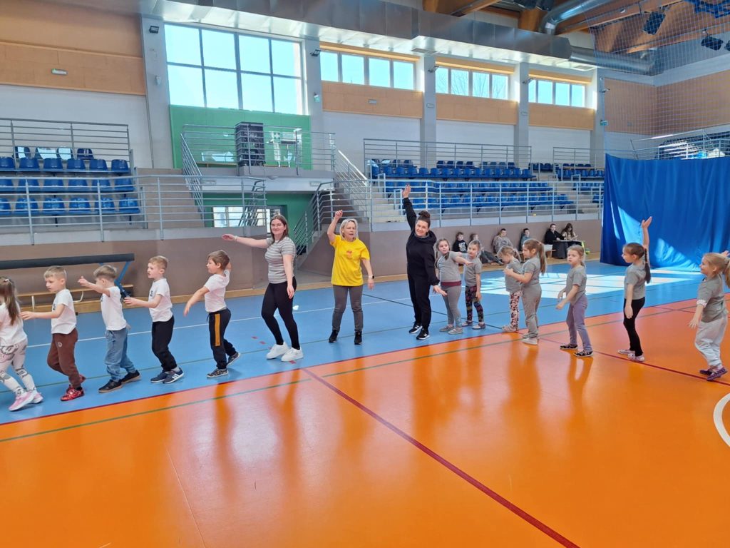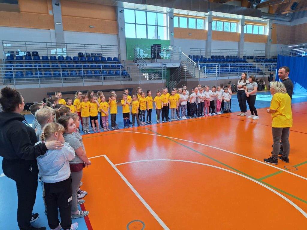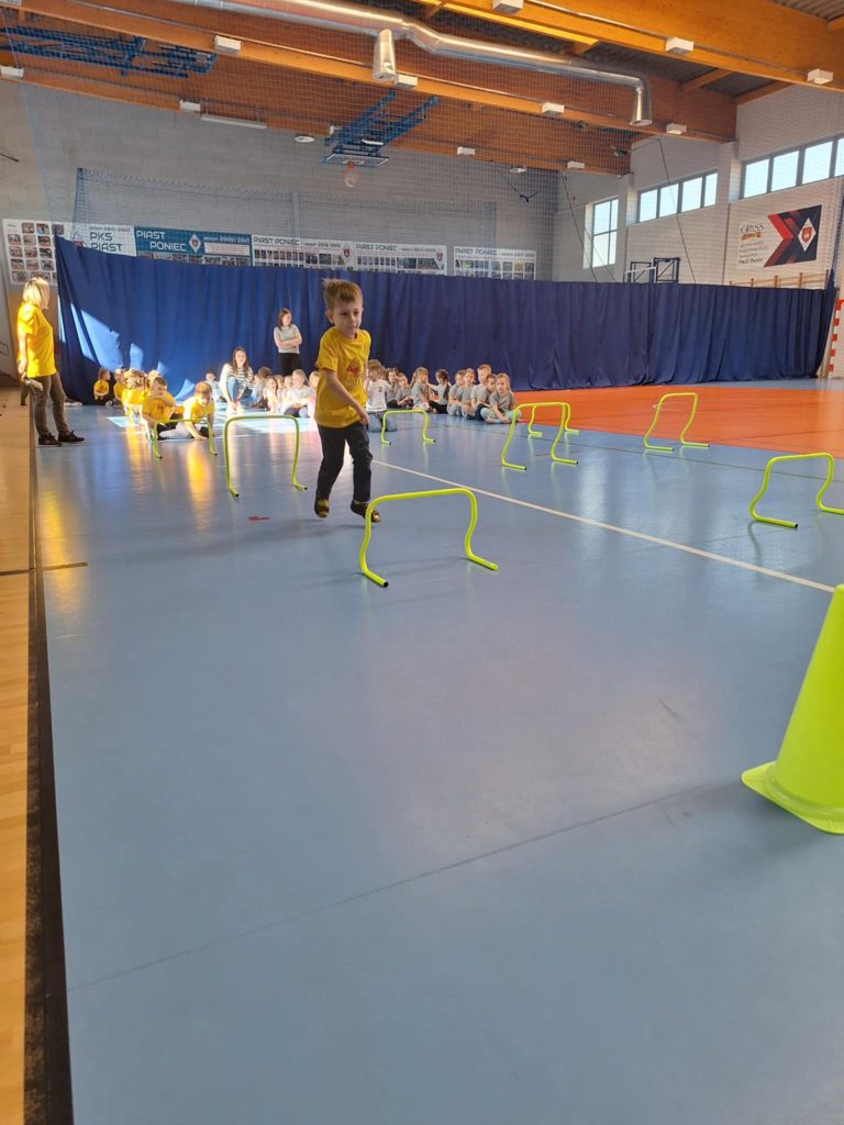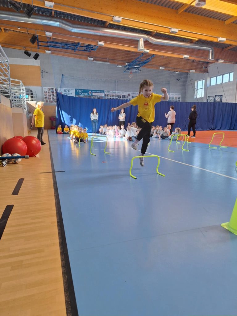 Zawody lekkoatletyczne na hali sportowej dla grupy 6-latków „Kubusie „,”Zajączki „, „Kotki” przebiegły w bardzo radosnej i sportowej atmosferze. Dzieci miały okazję wziąć udział w różnych konkurencjach dostosowanych do ich wieku i możliwości, takich jak biegi sprinterskie, skoki na piłkach oraz tory przeszkód. Każda konkurencja była okazją do świetnej zabawy, a jednocześnie rozwijała koordynację, szybkość i sprawność ruchową. W zawodach liczył się przede wszystkim udział, zaangażowanie i dobra zabawa. Dzieci dopingowały się nawzajem, ucząc się zasad fair play i współpracy w grupie. Na zakończenie każda grupa otrzymała dyplom, co sprawiło im ogromną radość i było miłym podsumowaniem całego wydarzenia. Zawody okazały się dużym sukcesem i pozostawiły wiele pozytywnych wspomnień.