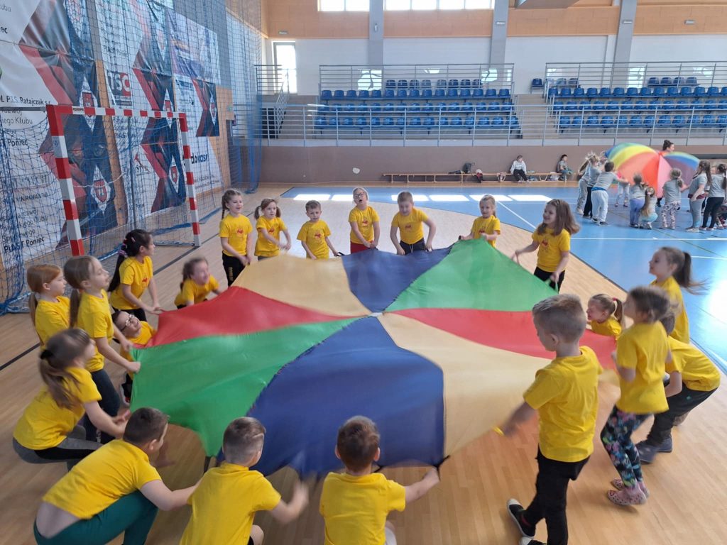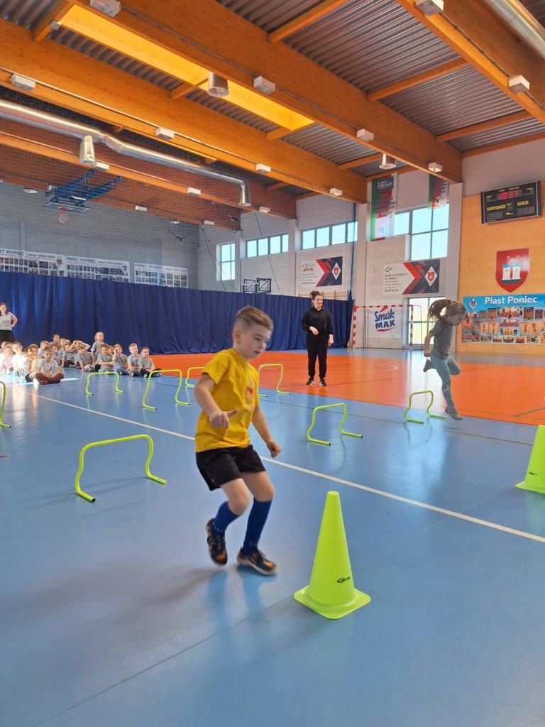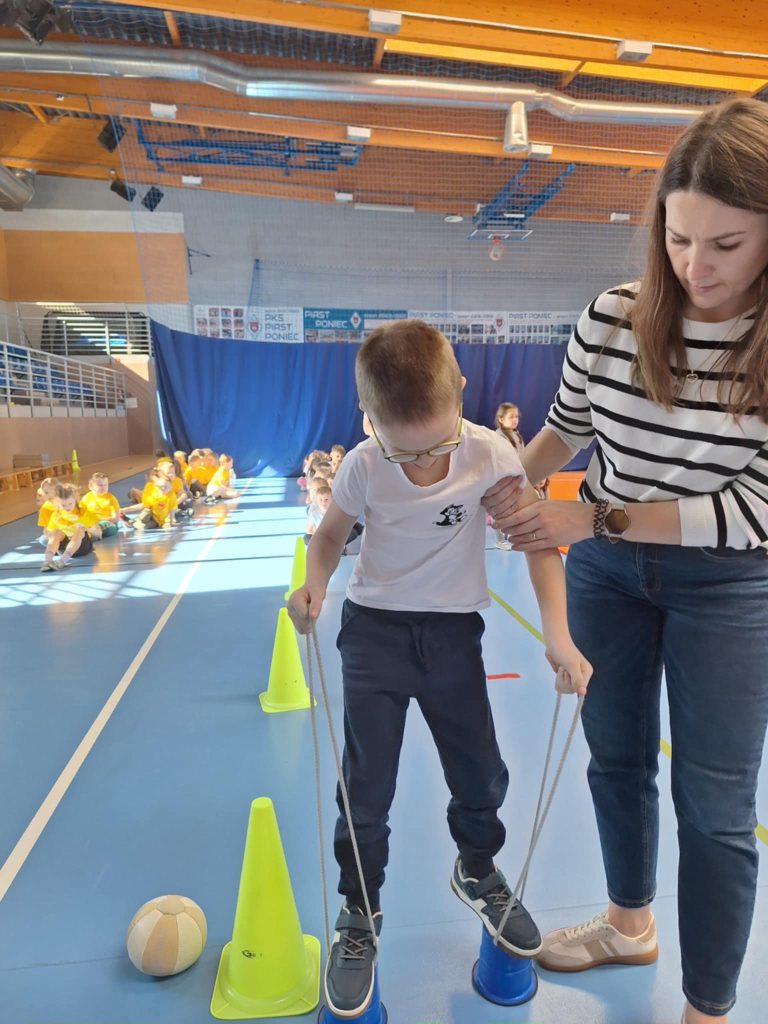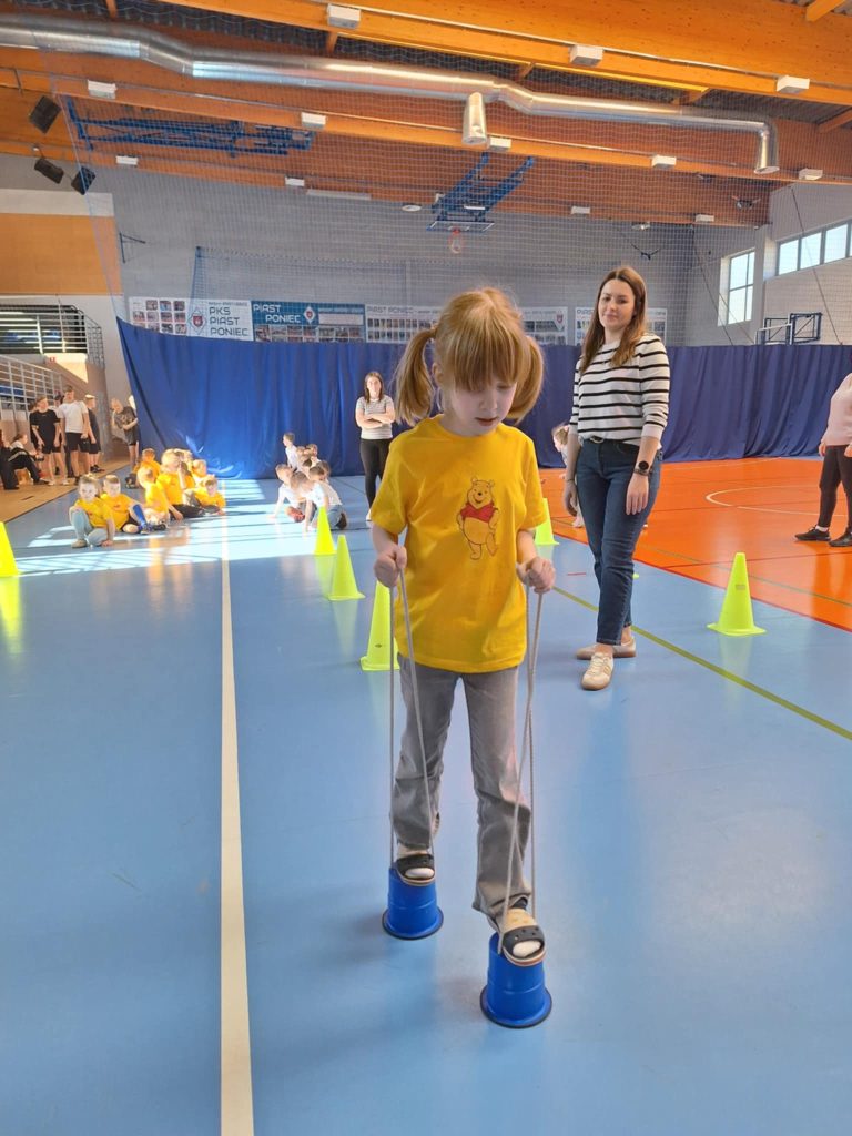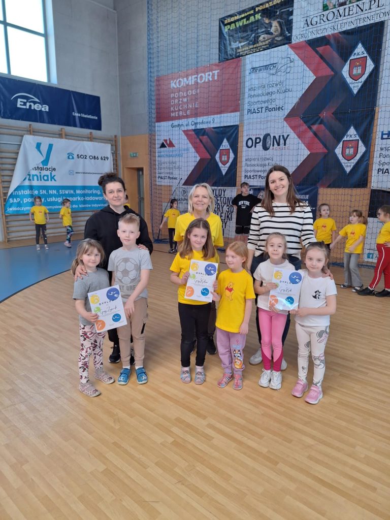Zawody lekkoatletyczne na hali sportowej dla grupy 6-latków „Kubusie „,”Zajączki „, „Kotki” przebiegły w bardzo radosnej i sportowej atmosferze. Dzieci miały okazję wziąć udział w różnych konkurencjach dostosowanych do ich wieku i możliwości, takich jak biegi sprinterskie, skoki na piłkach oraz tory przeszkód. Każda konkurencja była okazją do świetnej zabawy, a jednocześnie rozwijała koordynację, szybkość i sprawność ruchową. W zawodach liczył się przede wszystkim udział, zaangażowanie i dobra zabawa. Dzieci dopingowały się nawzajem, ucząc się zasad fair play i współpracy w grupie. Na zakończenie każda grupa otrzymała dyplom, co sprawiło im ogromną radość i było miłym podsumowaniem całego wydarzenia. Zawody okazały się dużym sukcesem i pozostawiły wiele pozytywnych wspomnień.