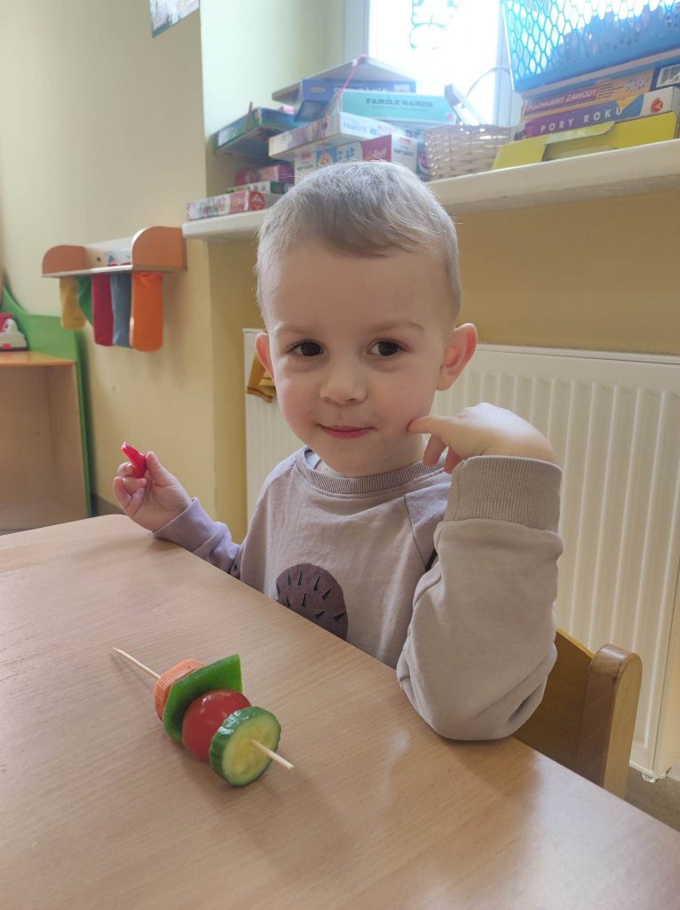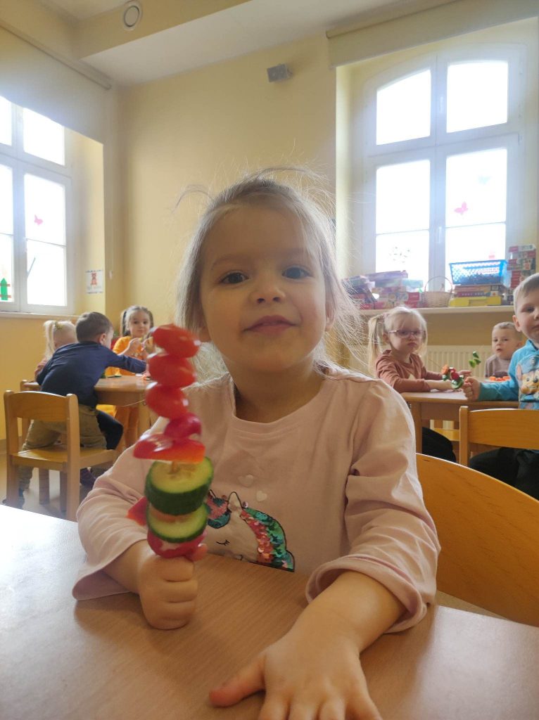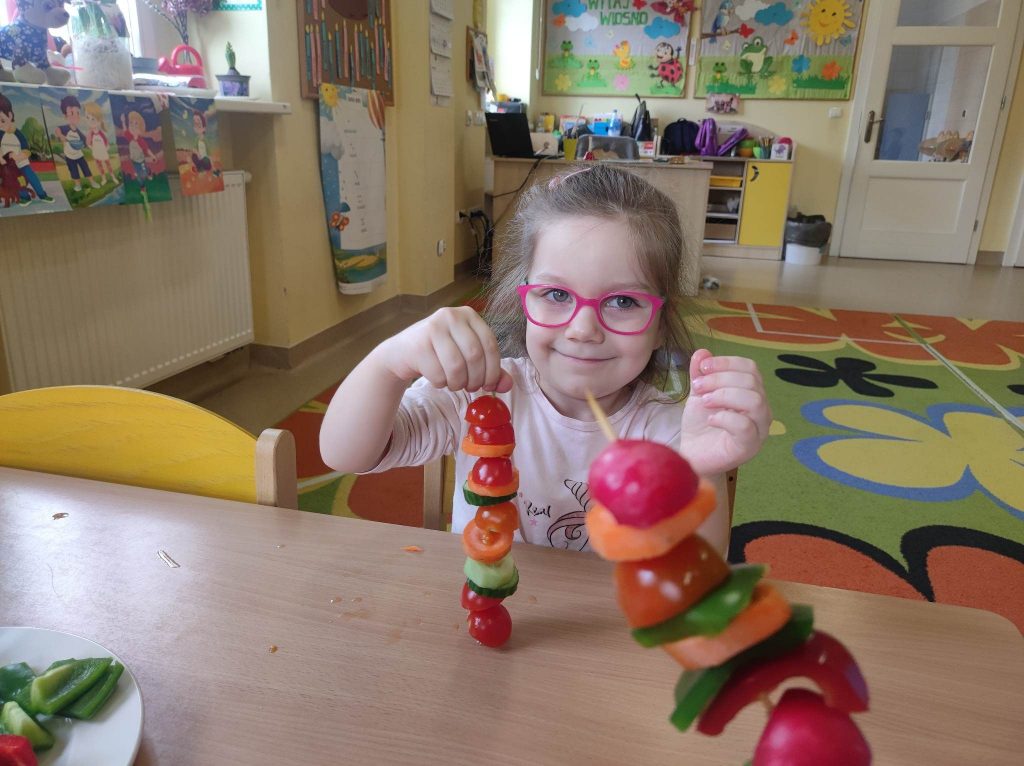 Zdrowe i kolorowe szaszłyki warzywne Cofnij W piątek Krasnale podsumowując temat o wiosennym zdrowiu postanowiły zrobić pyszne i kolorowe szaszłyki warzywne. Dzieci pracowicie nabijały na patyczki ulubione warzywa, a kiedy wszystko było gotowe ze smakiem je zjadły.